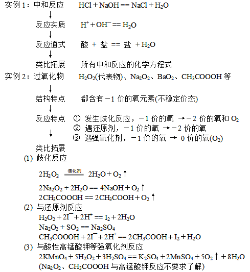 同类反应的原理相似,常可用一个通式表示,记住一个通式就记住了一类反应的化学方程式;同类物质的性质相似,记住典型物质的性质,也就记住了一类物质的性质。这样就做到了以一当十,甚至以一当百。