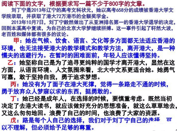 阅读下面的材料,根据要求写一篇不少于800字的文章。(60分)2013年10月,辽宁省文科状元刘丁宁放弃为她提供巨额奖学金的香港大学又回到高中复读,准备参加来年的高考。对此,大家十分不解。有人规劝,让她申请重新返校,因为复读没有把握考出那样好的成绩。有人惋惜,多少人梦寐以求却难以企及的国际名校怎能轻易放弃。有人气愤,说她放弃巨额奖学金是“烧”糊涂了。她却坚持自己的选择。据说,这样做的理由是:港大网上学习时间太长,自己很不适应;再者,自己的梦想是追寻更纯粹的国学,通过复读而考入北大中文系能够更好地完成自己的学业。要求选好角度,确定立意,明确文体,自拟题目;不要脱离材料内容及含意的范围作文,不要套作,不得抄袭。