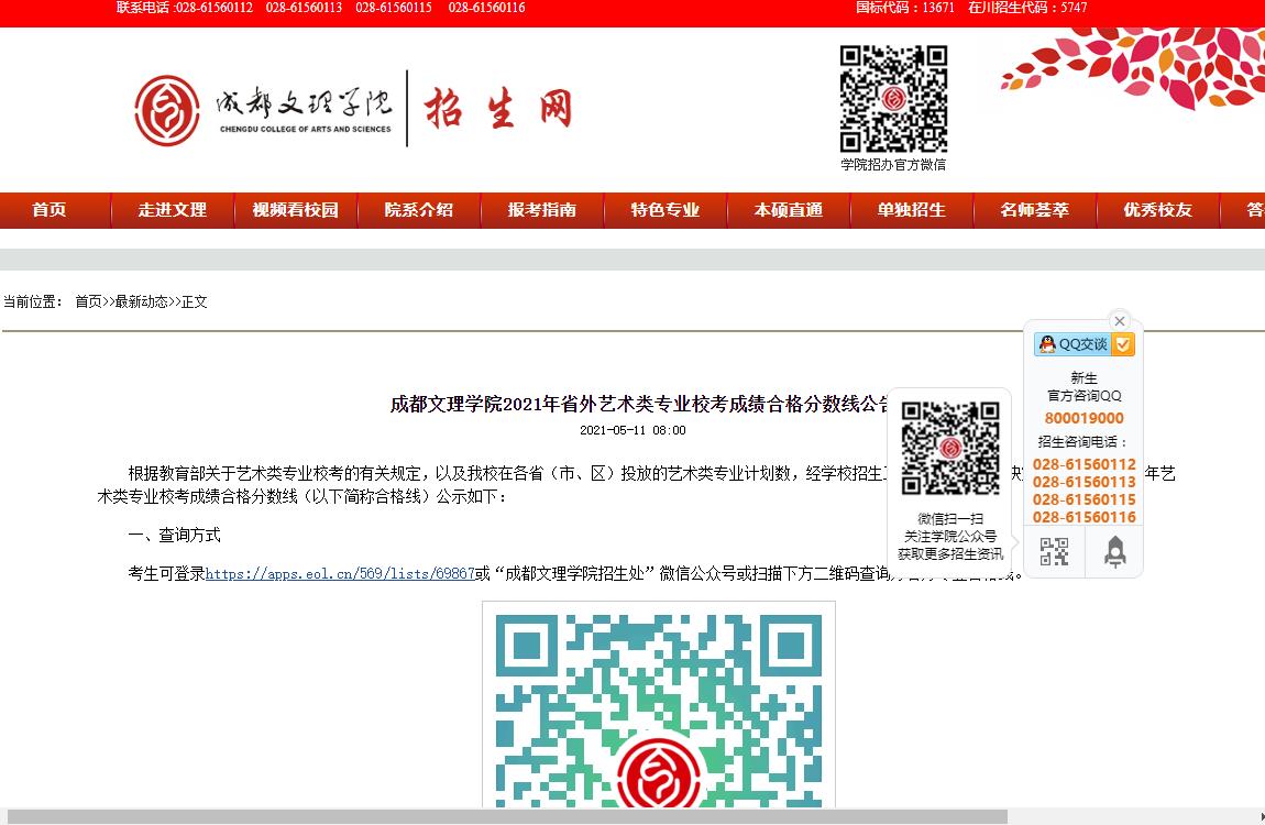 成都文理学院2021年省外艺术类专业校考成绩合格分数线公告