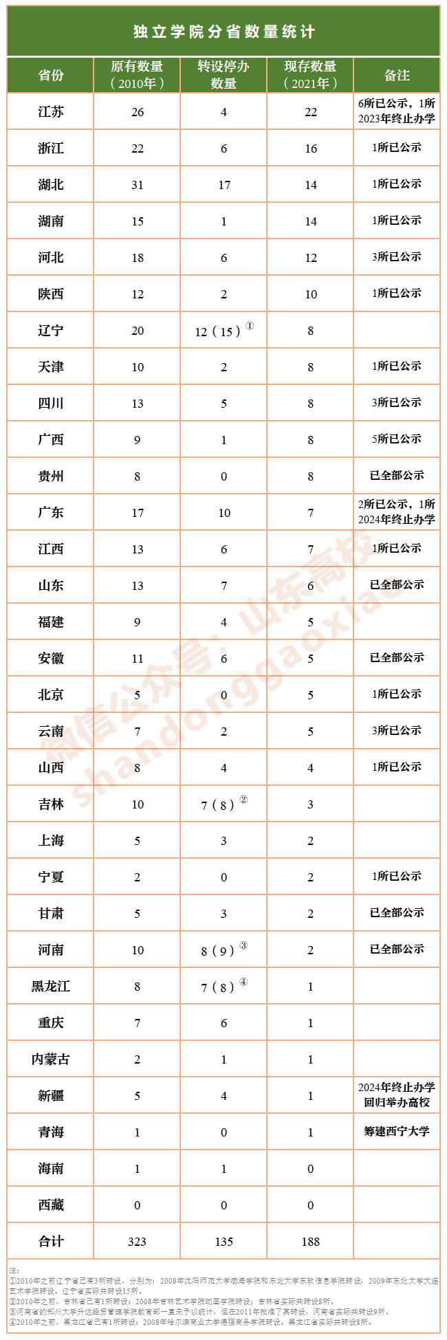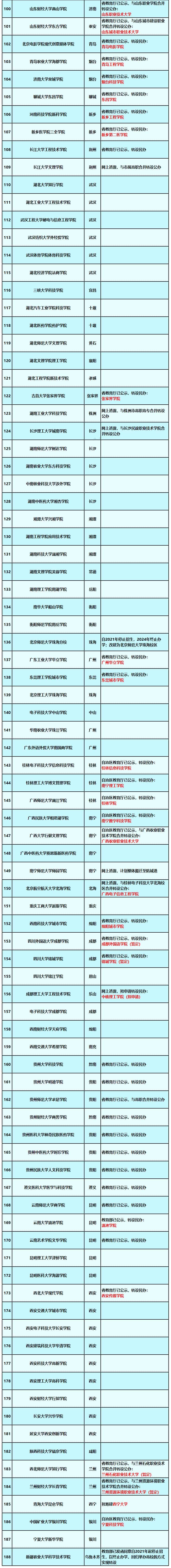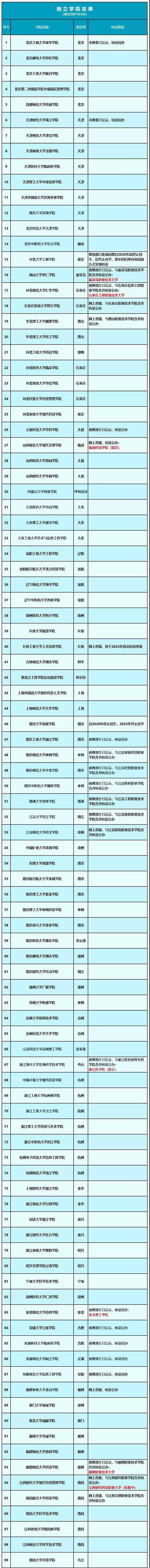 截至2021年4月21日,全国尚未完成转设的独立学院汇总如下: