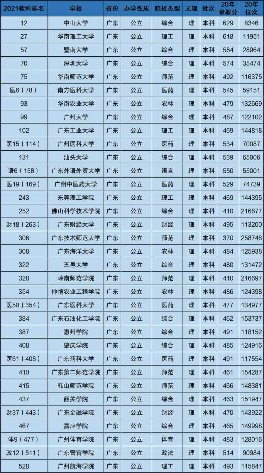 软科的中国大学排名在国内具有一定的认可度,此处小编根据该榜单整理出了所有位于广东的公立大学排名情况,以下是详细名单: