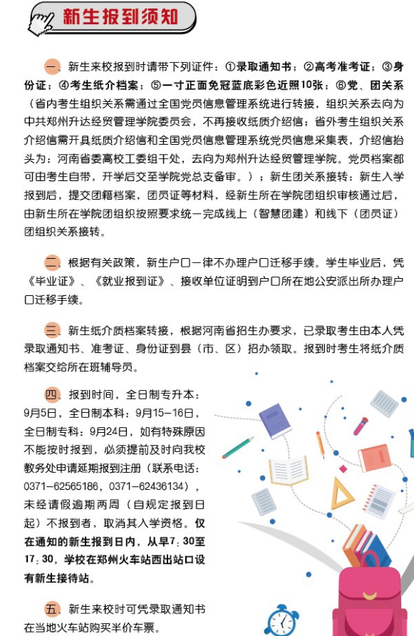 2020年郑州升达经贸管理学院入学须知发布,全日制本科报到时间是9月15日-16日,专科报到时间是9月24日。