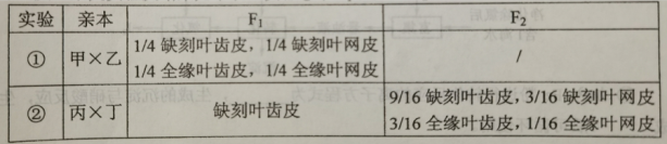 植物的性状有的由1对基因控制,有的由多对基因控制。一种二倍体甜瓜的叶形有缺刻叶和全缘叶,果皮有齿皮和网皮。为了研究叶形和果皮这两个性状的遗传特点,某小组用基因型不同的甲乙丙丁4种甜瓜种子进行实验,其中甲和丙种植后均表现为缺刻叶网皮。杂交实验及结果见下表(实验②中F1自交得F2)。