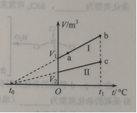 (1)(5分)如图,一定量的理想气体经历的两个不同过程,分别由体积-温度(V-t)图上的两条直线I和Ⅱ表示,V1和V2分别为两直线与纵轴交点的纵坐标。t0是它们的延长线与横轴交点的横坐标,t0=-273.15°C;a为直线I上的一点。由图可知,气体在状态a和b的压强之比pa/pb=______;气体在状态b和c的压强之比pa/pc=_________。