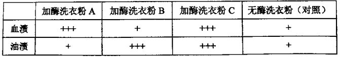 加酶洗衣粉是指含有酶制剂的洗衣粉。某同学通过实验比较了几种洗衣粉的去渍效果(“+”越多表示去渍效果越好),实验结果见下表。