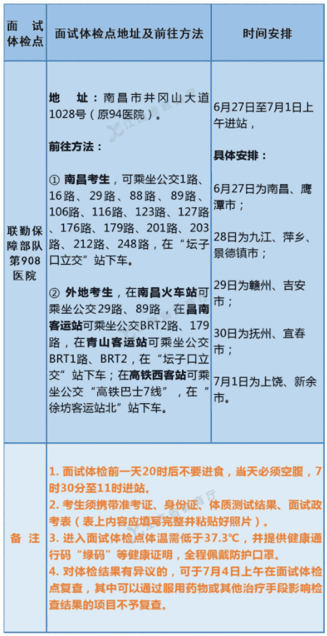 政治考核、身体初查和体质测试审查合格考生,6月27日至7月1日上午,按计划(见后)前往联勤保障部队第908医院(南昌)参加面试体检,面试体检当天必须空腹,携带身份证、准考证、体质测试结果和面试政考表(填写完整并粘贴好照片)。