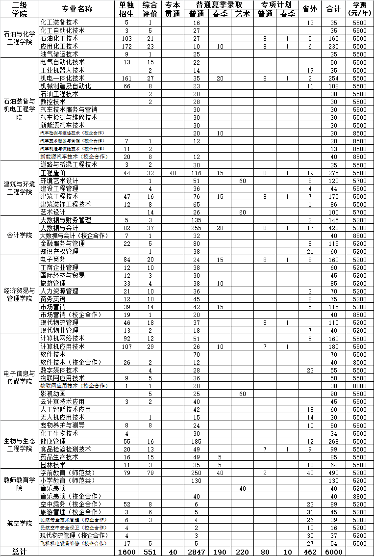 东营职业学院2021年招生计划一览表