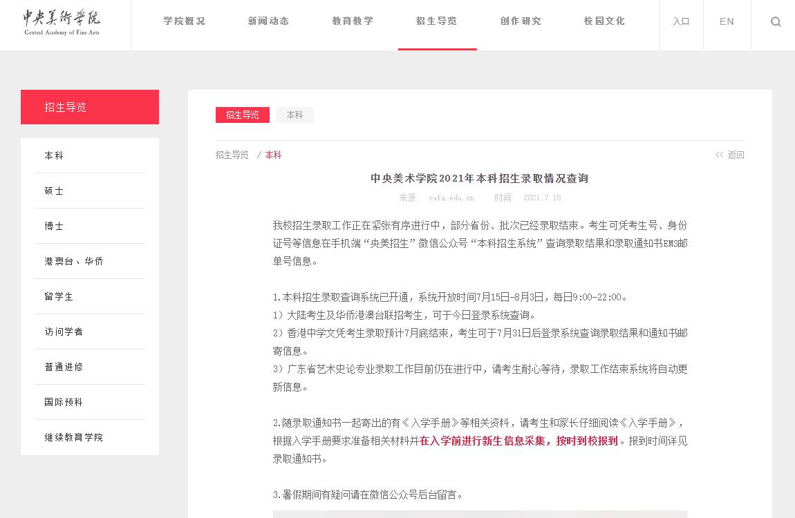 官网信息可能为陆续更新内容,想查看最新内容可点击链接查看>>中央美术学院2021年本科招生录取情况查询【一键点击去官网浏览】