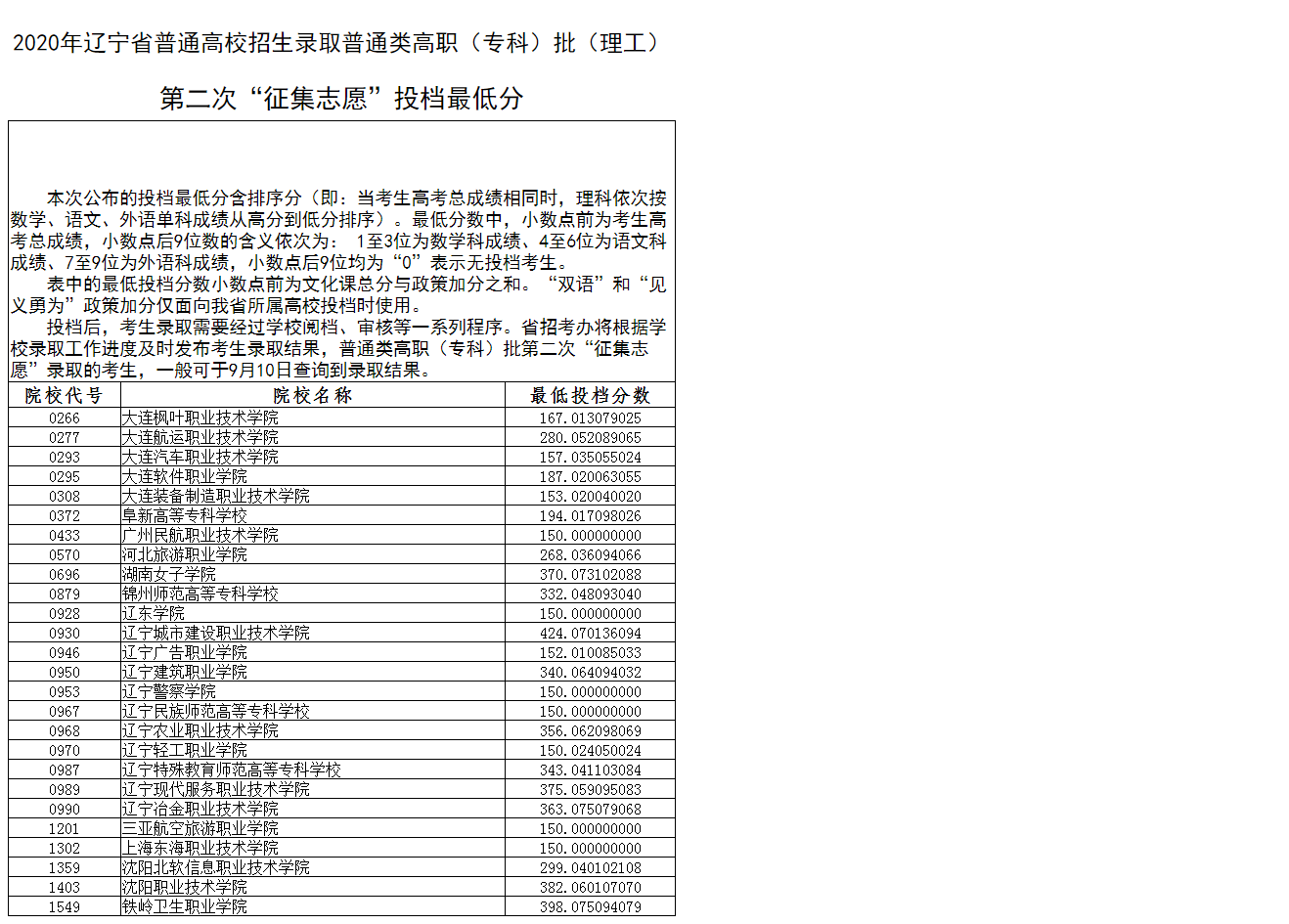 辽宁2020专科批第二次征集志愿投档分数线一览