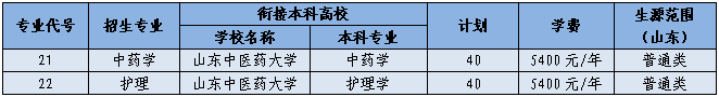 我校与山东中医药大学继续实施“3+2”对口贯通分段培养本科教育,报考考生需参加2021年夏季高考,按专科普通类常规批填报志愿。“3+2”本科入学后,前三年在我校学习,经考试合格后,后两年在对口本科院校(山东中医药大学)学习。