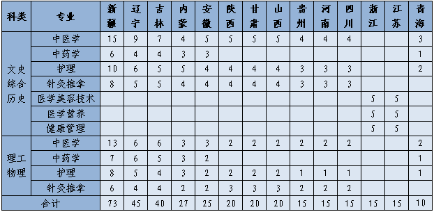 我校省外招生专业为中医学、中药学、护理、针灸推拿、医学美容技术、医学营养、健康管理,计划355人,包括新疆、吉林、辽宁、内蒙古、陕西、甘肃、贵州、河南、安徽、青海、山西、四川、江苏、浙江。省外各招生专业代号请查看各省《填报志愿指南》。