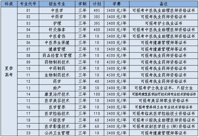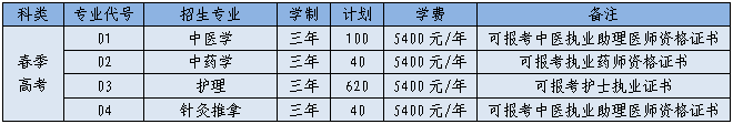 学校春季高考招生计划较去年保持稳定,招生专业增加至四个专业,为中医学(医药类)、中药学(医药类)、针灸推拿(医药类)、护理(护理类)。参加春季高考报名的考生报名应符合专业类别要求(专业类别为:医药类、护理类)。