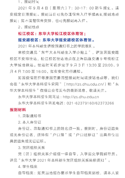 东华大学迎新系统及网站入口 2021新生入学须知及注意事项 时间:2021-07-28 15:53 大学动态 高考录取通知书发放后,同学们就要着手准备大学入学的相关事宜了,下面是东华大学的迎新网入口及新生入学注意事项等内容,供大家查阅。东华大学迎新系统及网站入口点击图片,进入迎新网新生入学须知及注意事项