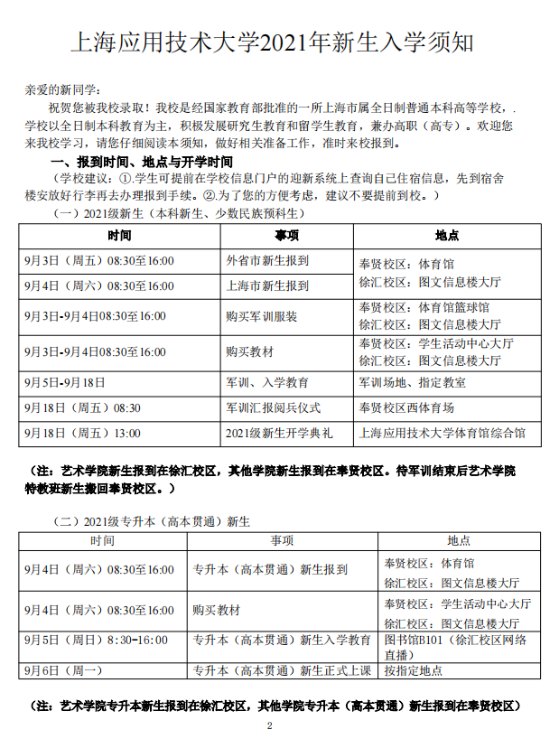 上海应用技术大学迎新系统及网站入口 2021新生入学须知及注意事项