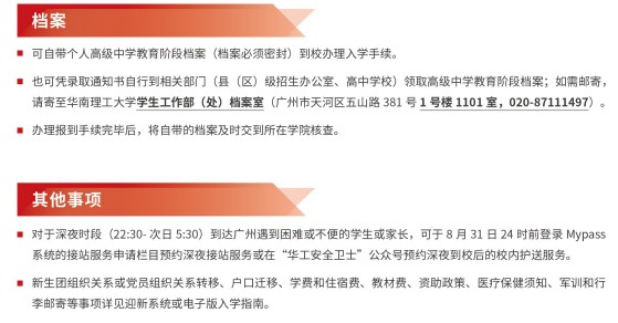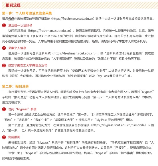 2021华南理工大学迎新系统 报到流程及入学须知 时间:2021-07-29 15:43 大学动态 大部分同学都已经受到了录取通知书,这个时候,就需要准备开学事宜了,小编整理了华南理工大学迎新系统及网站入口、新生入学须知等,来看一下!华南理工大学迎新网址入口《点击进入》华南理工大学新生入学须知及注意事项