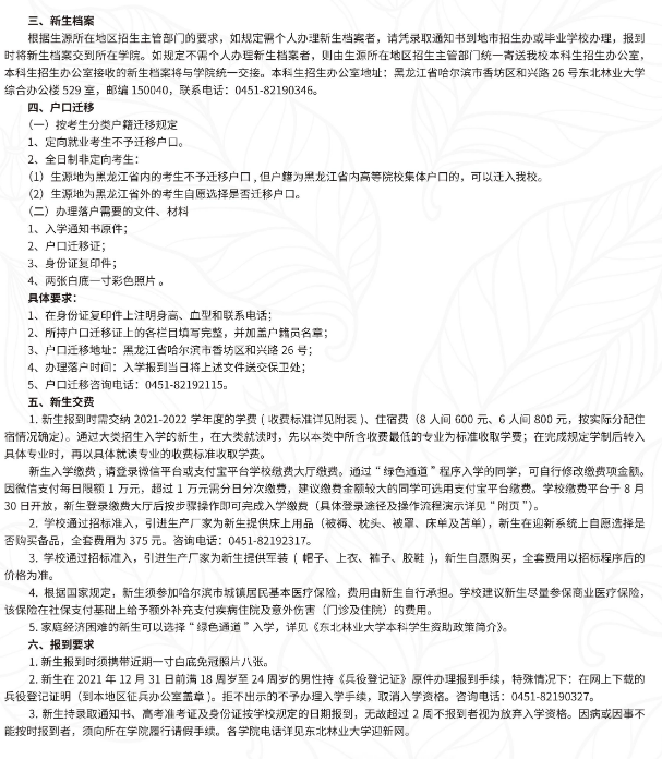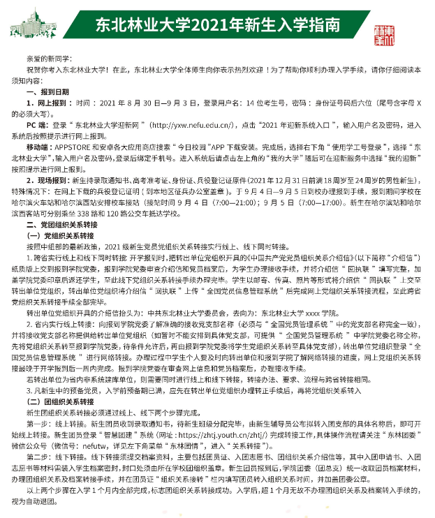 东北林业大学迎新系统及网站入口 2021新生入学须知及注意事项 时间:2021-08-01 14:34 大学动态 高考录取通知书发放后,同学们就要着手准备大学入学的相关事宜了,下面是东北林业大学迎新网入口及新生入学注意事项等内容,供大家查阅。东北林业大学迎新系统及网站入口点击图片,进入迎新网新生入学须知及注意事项