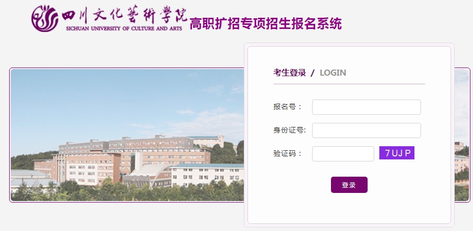 (一)点击进入四川文化艺术学院高职扩招专项招生报名系统(http://gzkzbm.sca.edu.cn),输入报名号、身份证号和验证码,点击“登录”按钮。