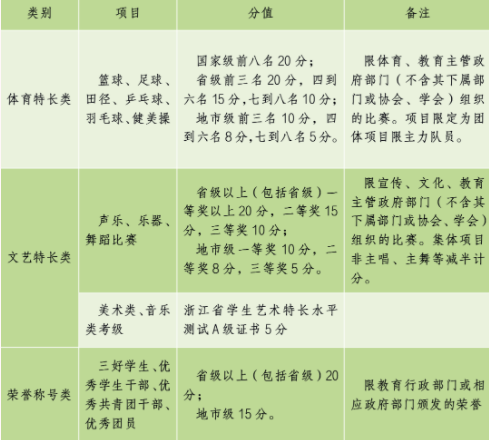 第十二条 综合素质测评成绩满分100分,其中面试满分80分,按面试实际成绩计入;特长考生的素质特长考核分最高计分20分,根据材料审核确定。素质特长计分项目及分值见下表: