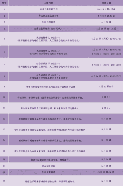 报名时间:2021年3月8日8:00—4月8日16:30,报名成功后请打印《2021年浙江邮电职业技术学院高职提前招生考生报名登记表》。