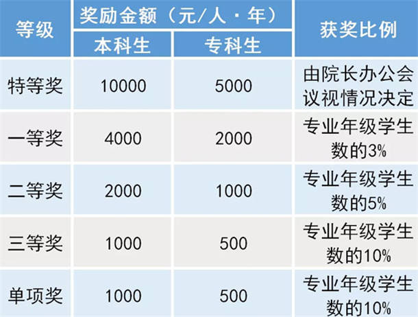 学校奖学金的等级、奖励金额和获奖比例一览表