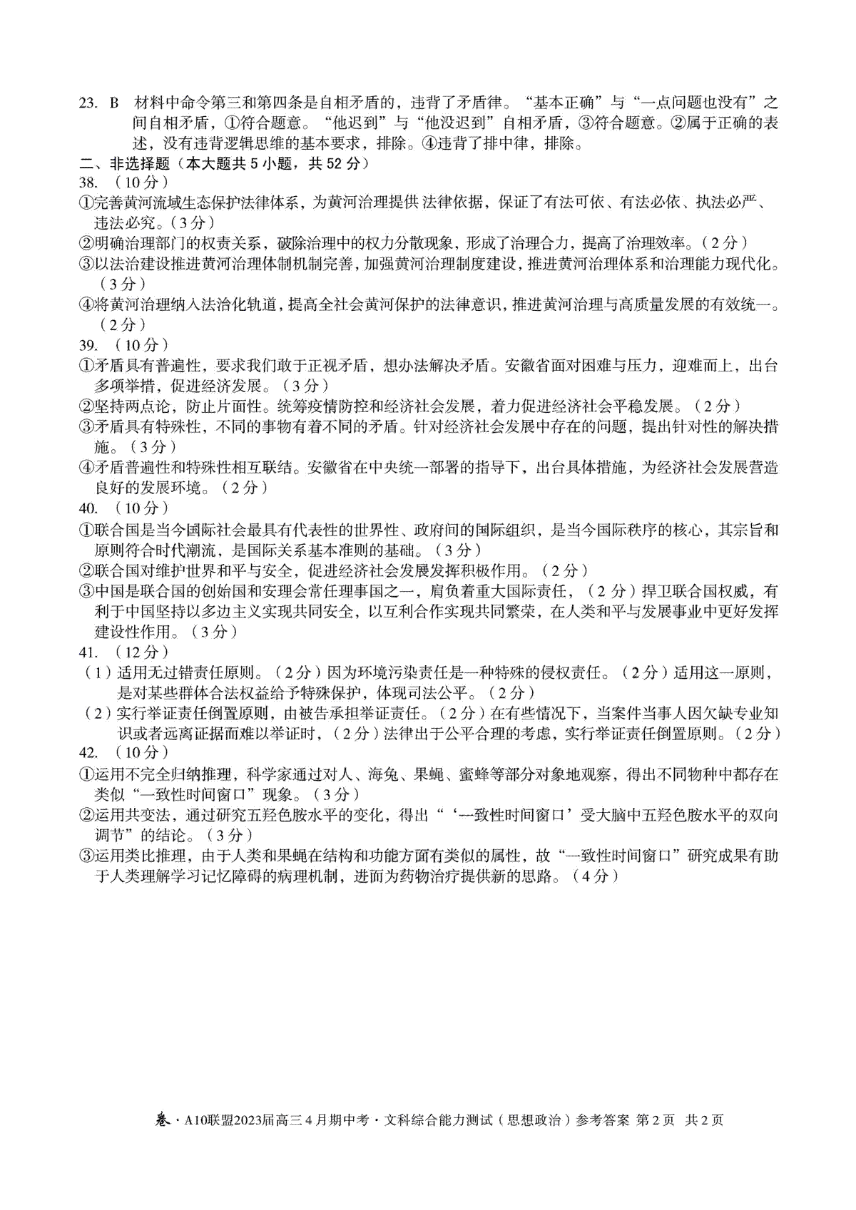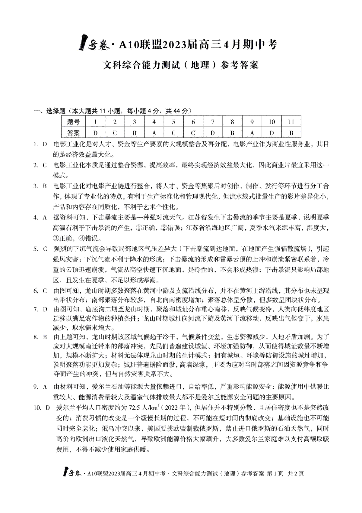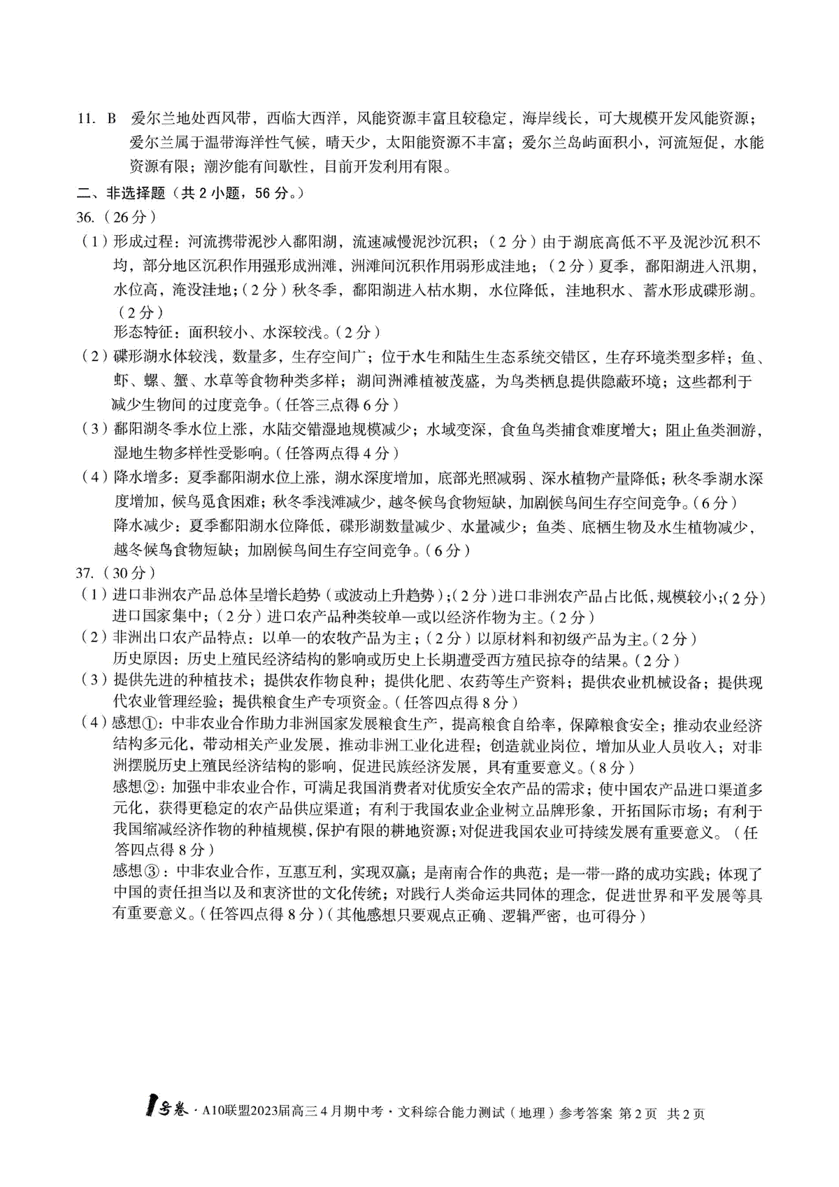 安徽A10联盟2023届高三4月联考文综答案
