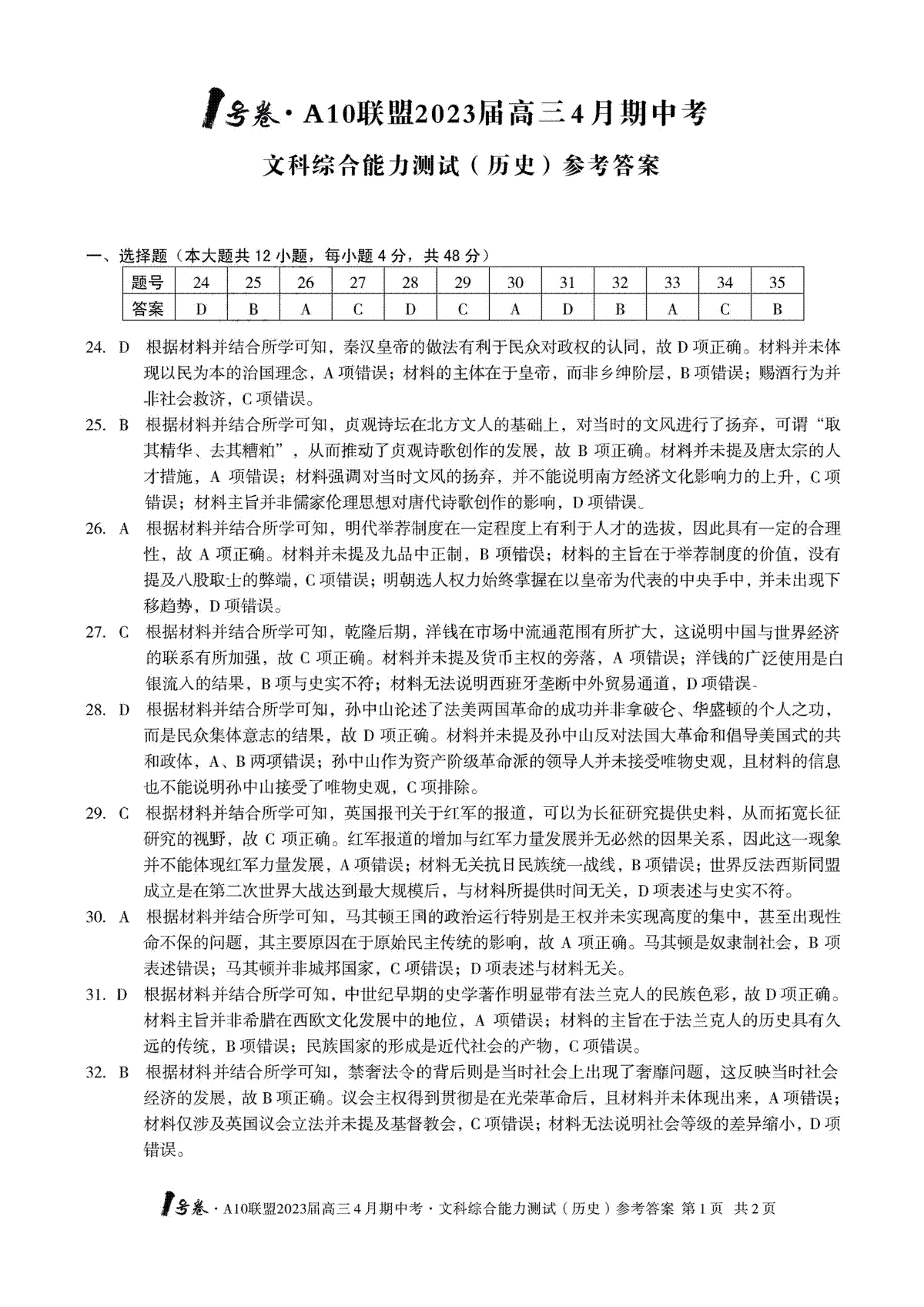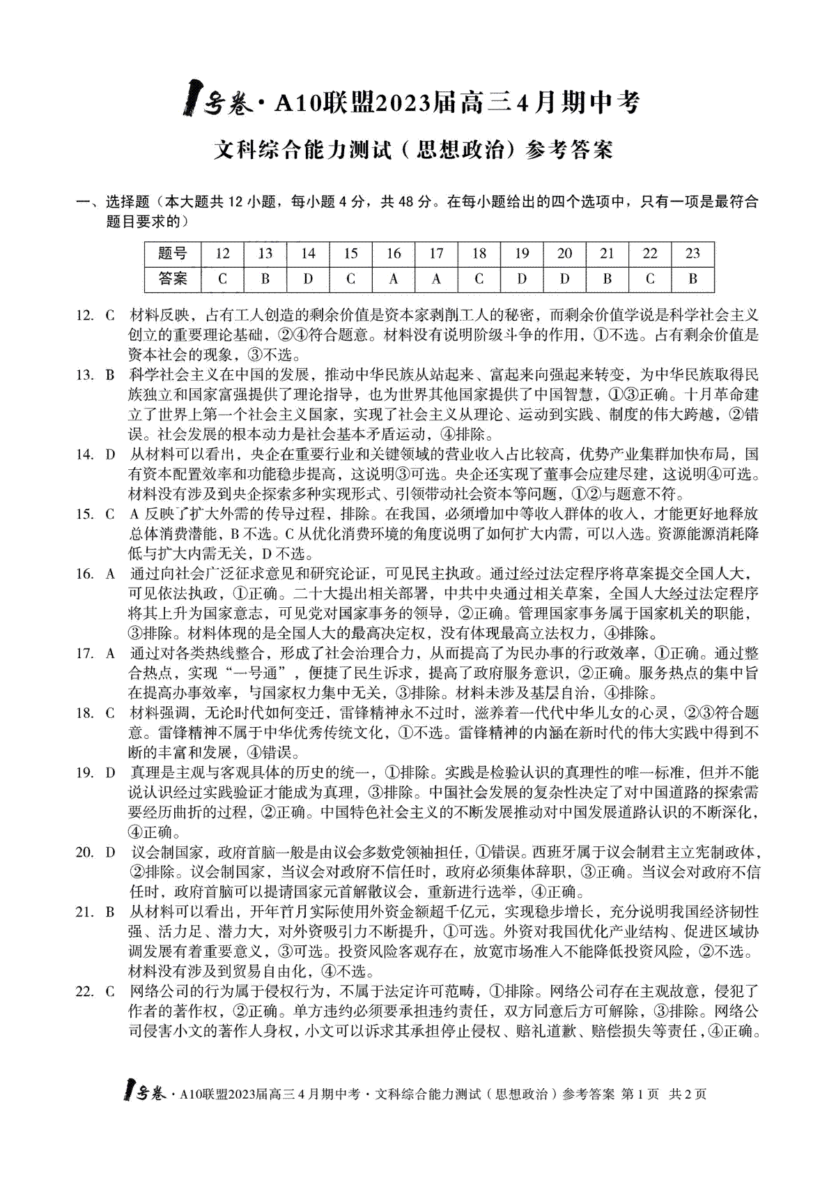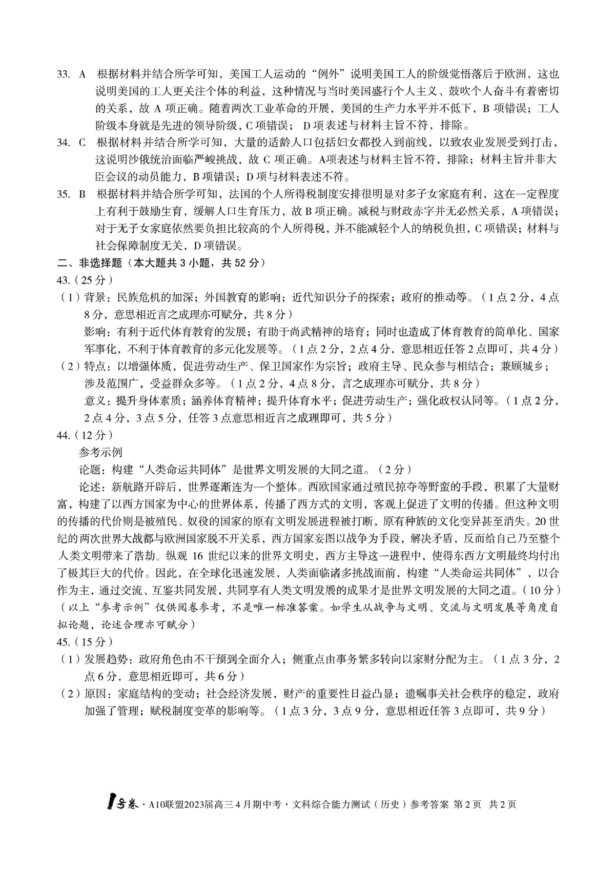 安徽A10联盟2023届高三4月联考文综答案