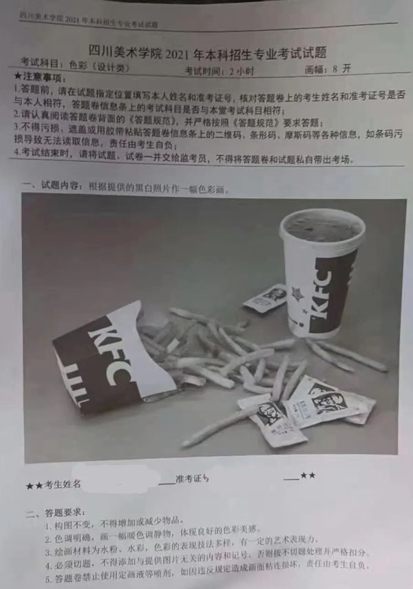 四川美术学院2021年第二场考试于2月26日在兰州、长沙、郑州举行,具体考题如下: