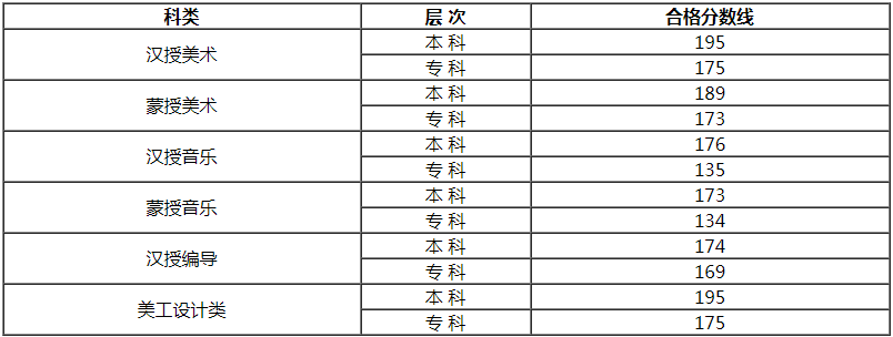 2021年内蒙古自治区普通高校招生艺术类统考专业课合格分数线已确定,现公告如下: