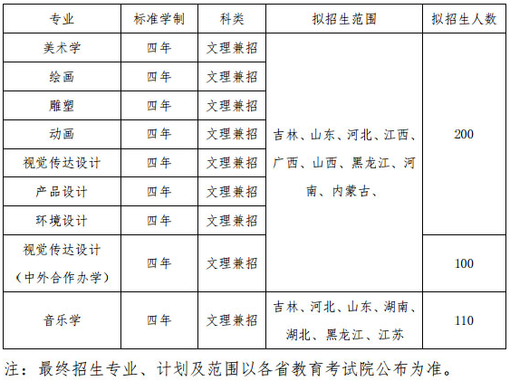 通化师范学院2021艺术类招生专业及计划