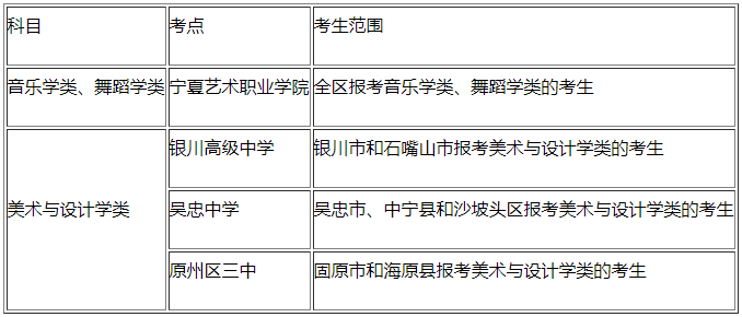 音乐学类和舞蹈学类的考生可于2021年1月8日下午到宁夏艺术职业学院考点,美术与设计学类的考生可于2021年1月15日下午到相应考点查看考场安排、考试注意事项、面试时间安排等。