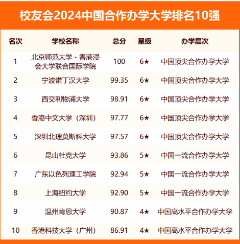 北京师范大学-香港浸会大学联合国际学院、宁波诺丁汉大学、西交利物浦大学、香港中文大学(深圳)、深圳北理莫斯科大学、昆山杜克大学、广东以色列理工学院、上海纽约大学、温州肯恩大学、香港科技大学(广州)雄居校友会2024中国合作办学大学排名前10强。