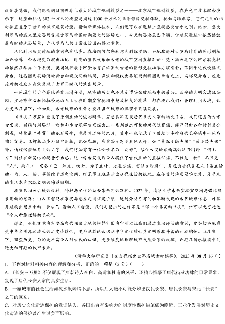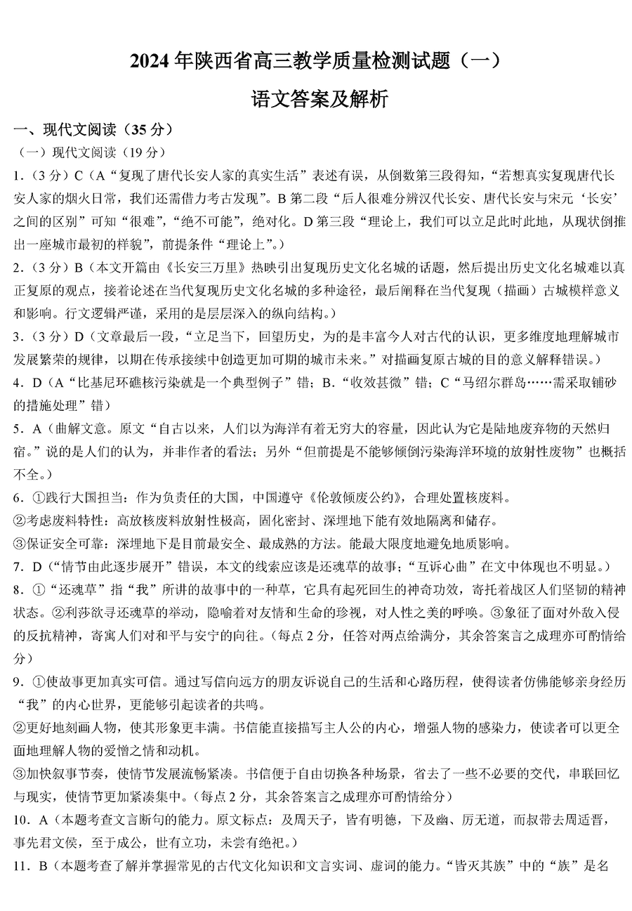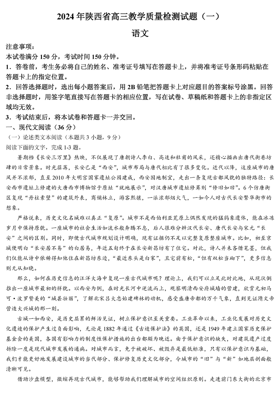 陕西省2024届高三教学质量检测(一)语文试题及答案