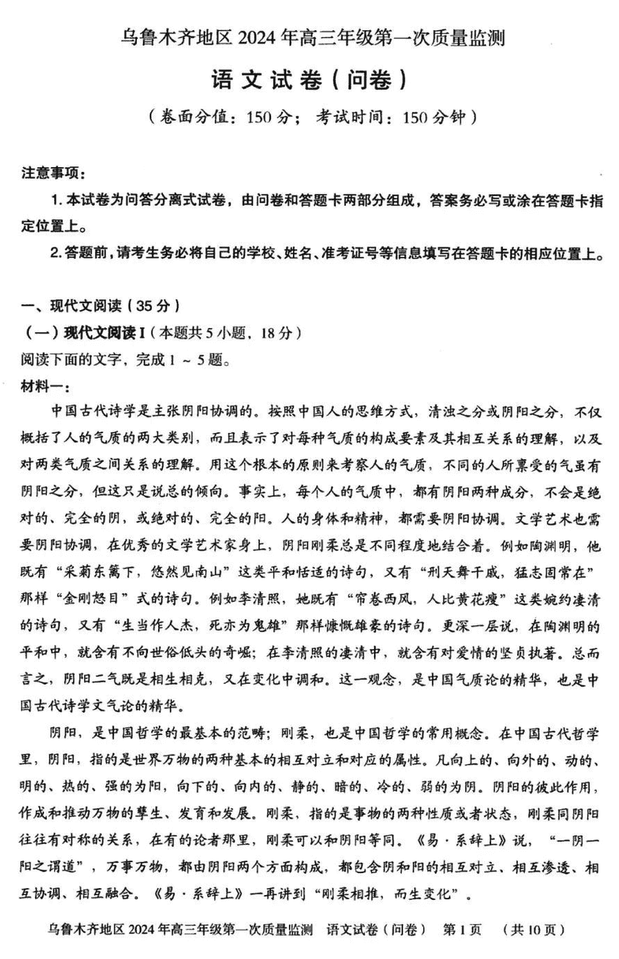 2024届新疆乌鲁木齐高三一模语文试题及答案