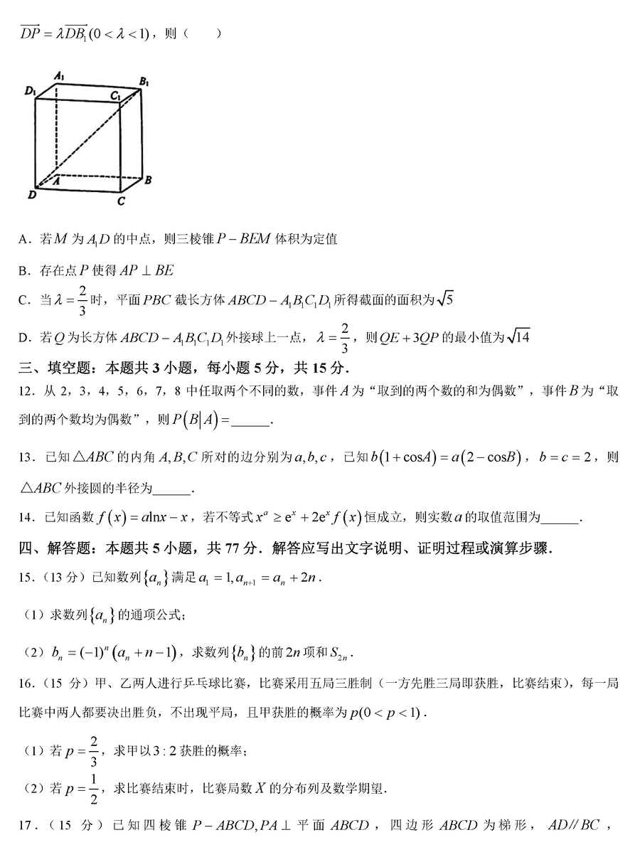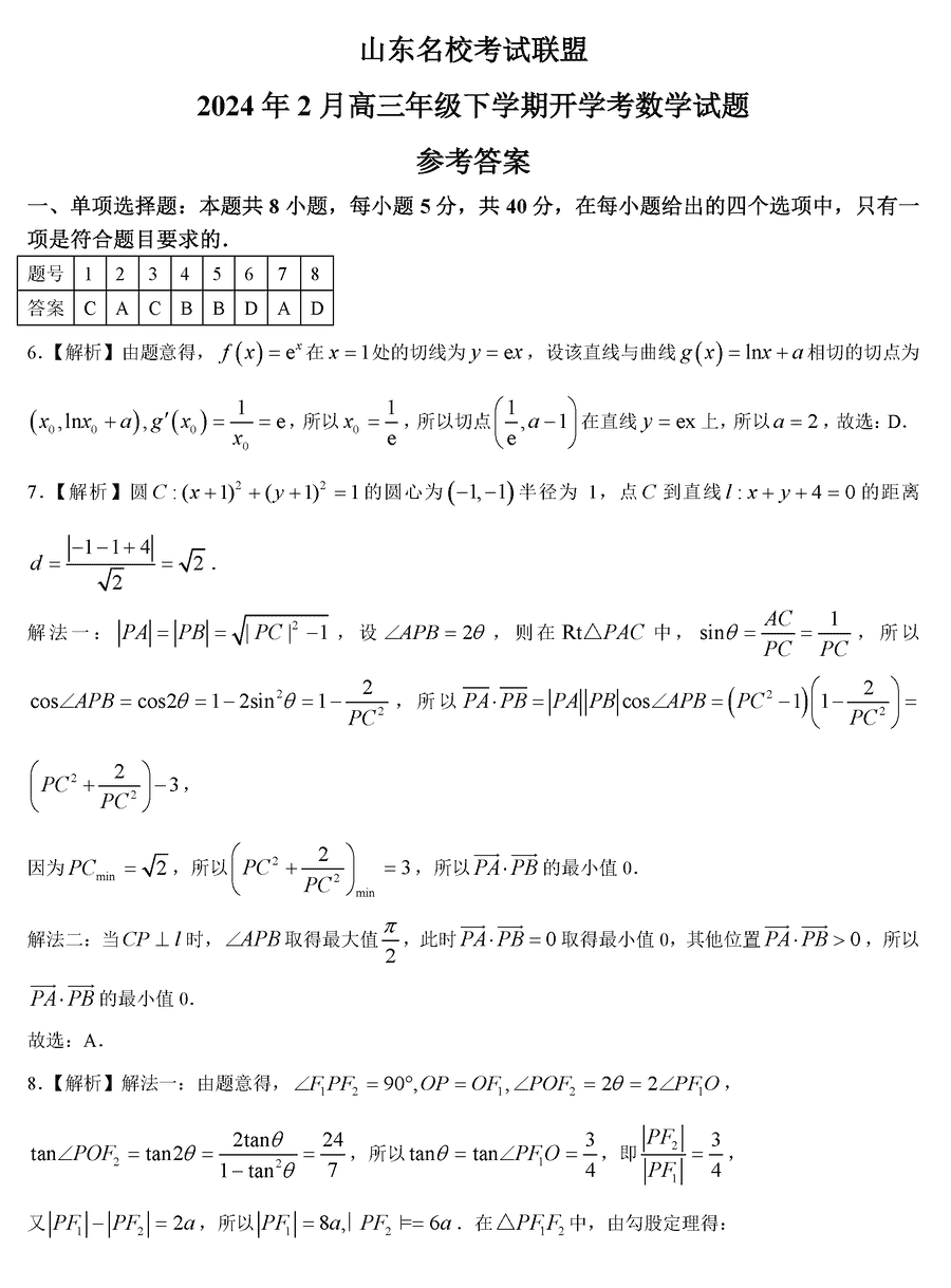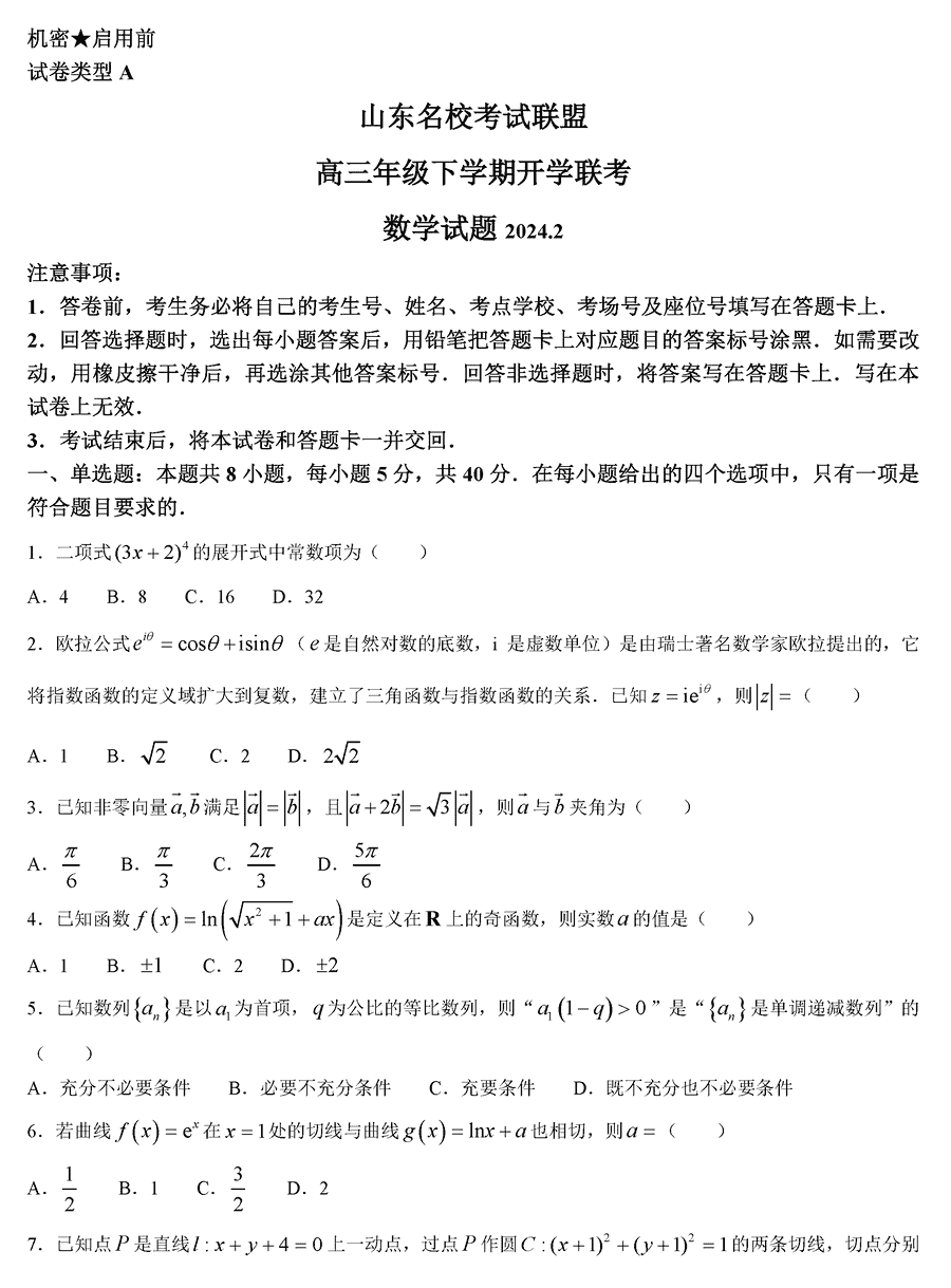 山东名校考试联盟2024届高三下学期开学联考数学试题及答案