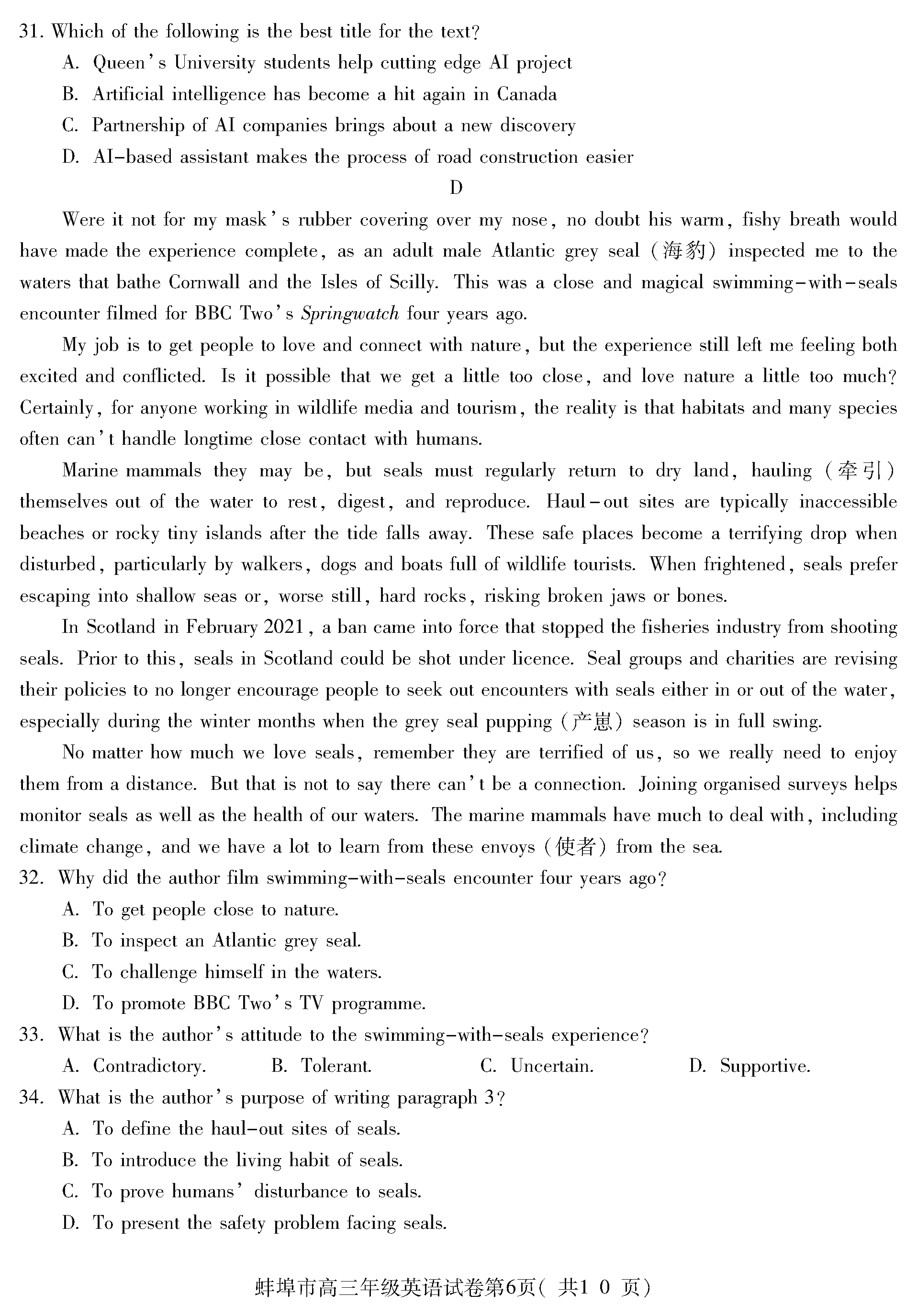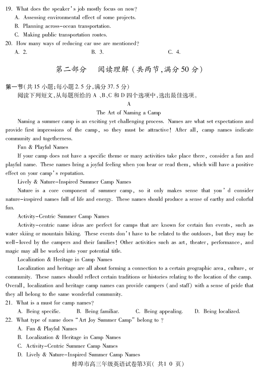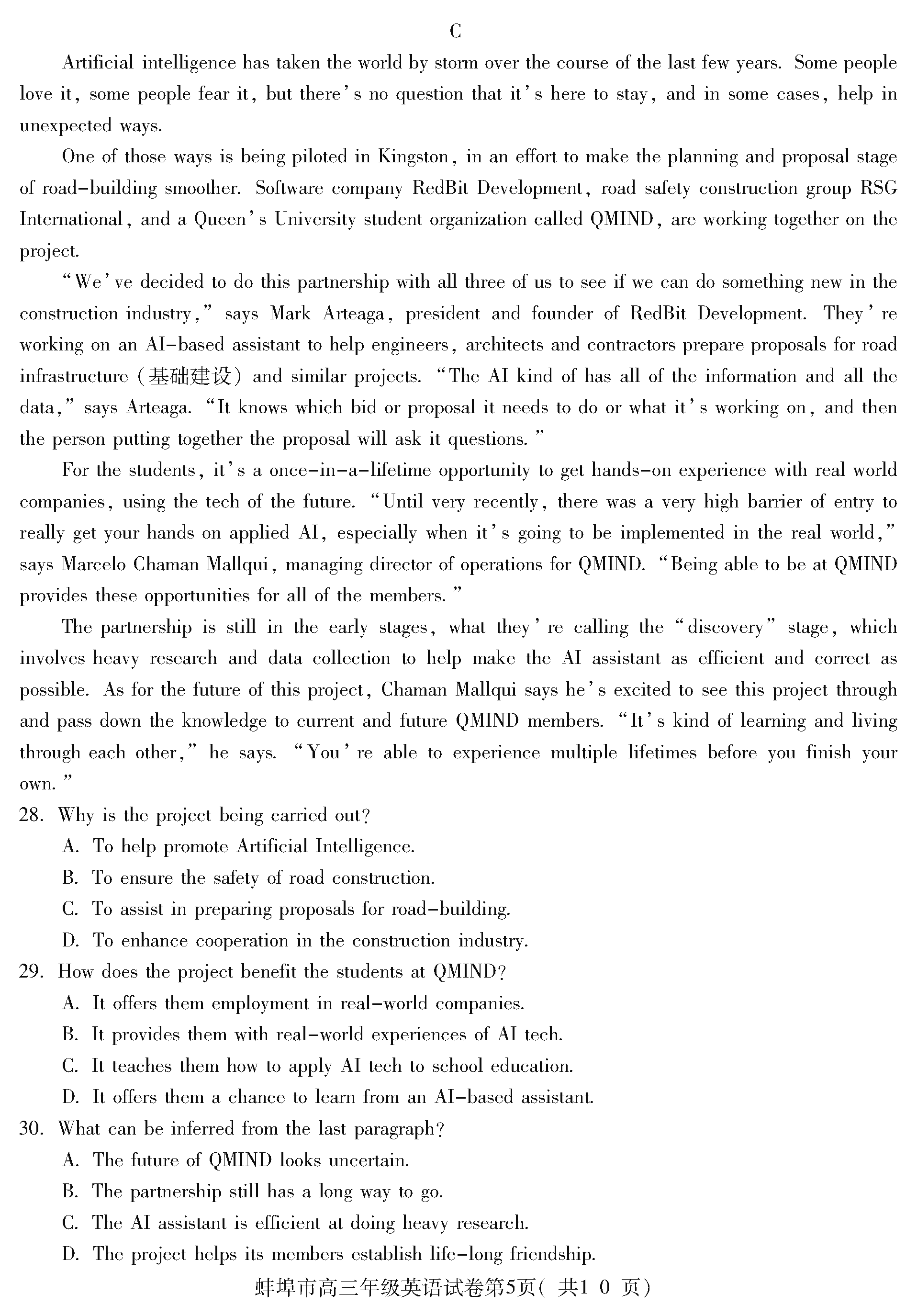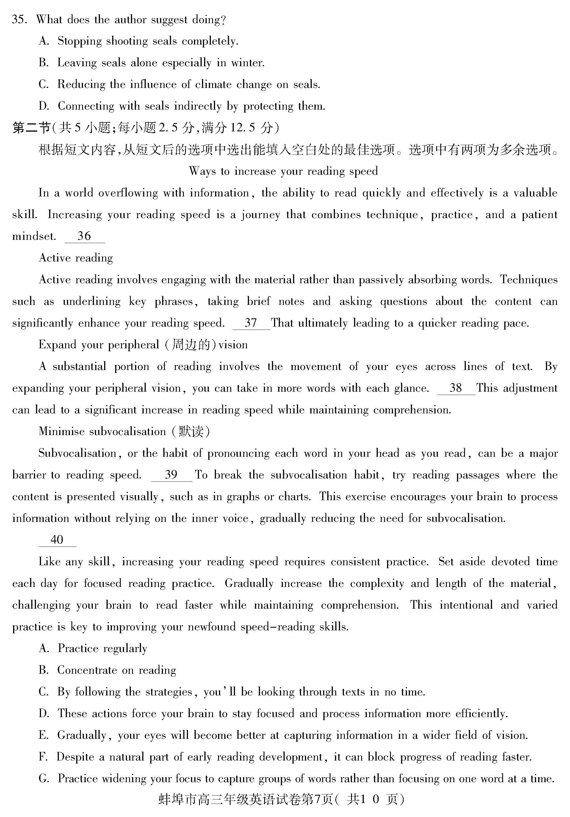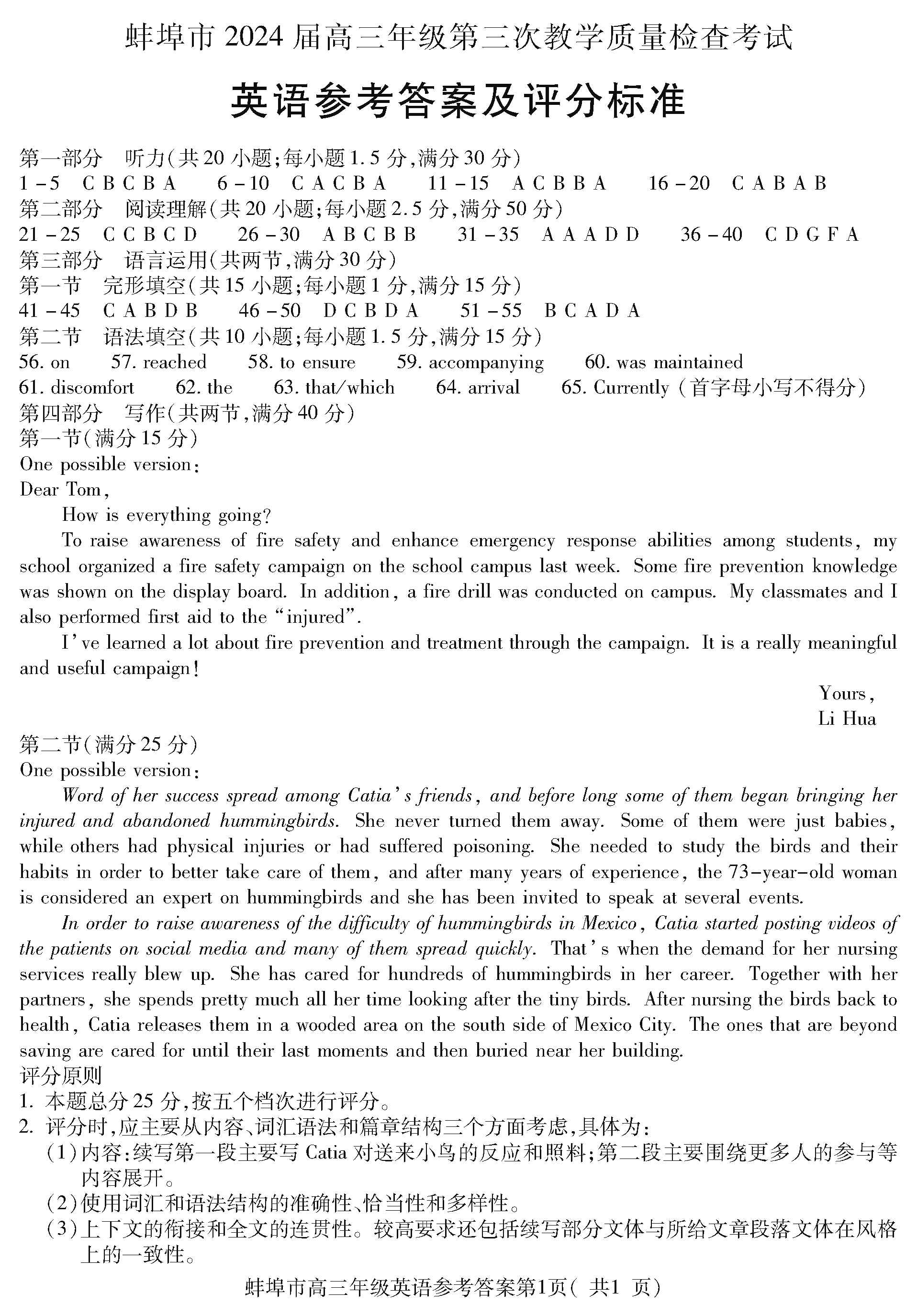 安徽蚌埠2024届高三下学期第三次质检英语试题及答案