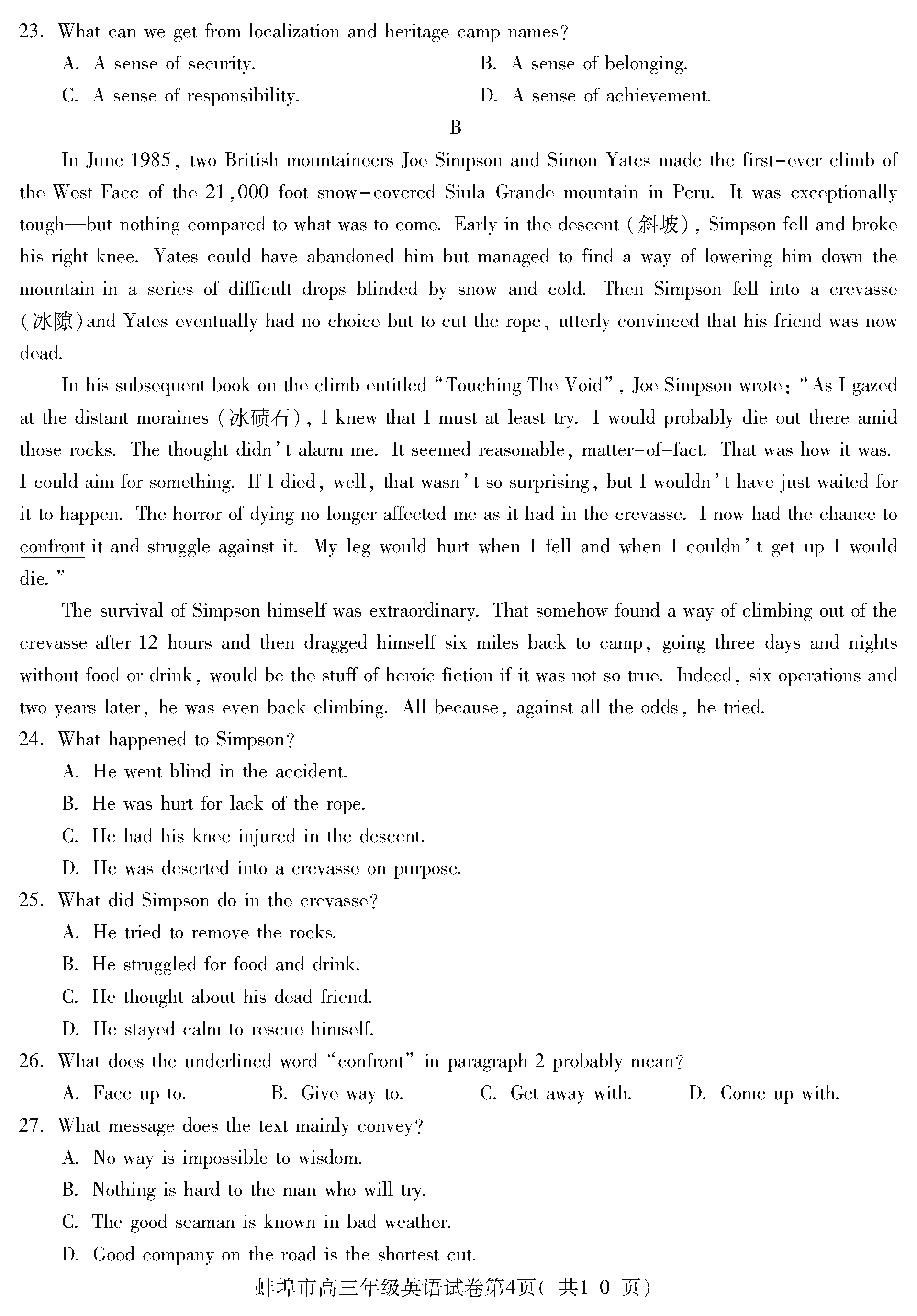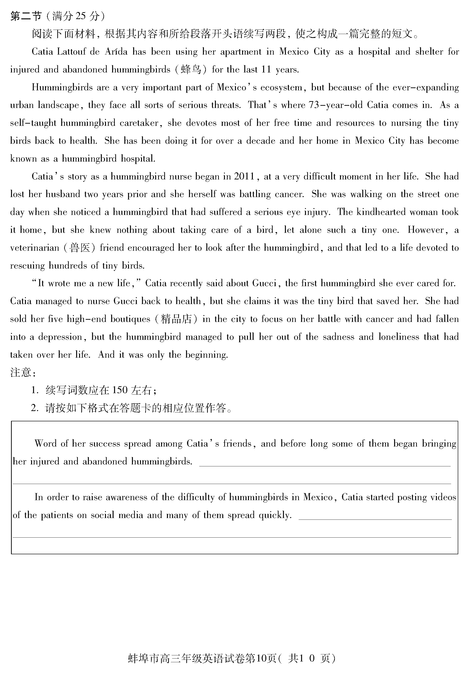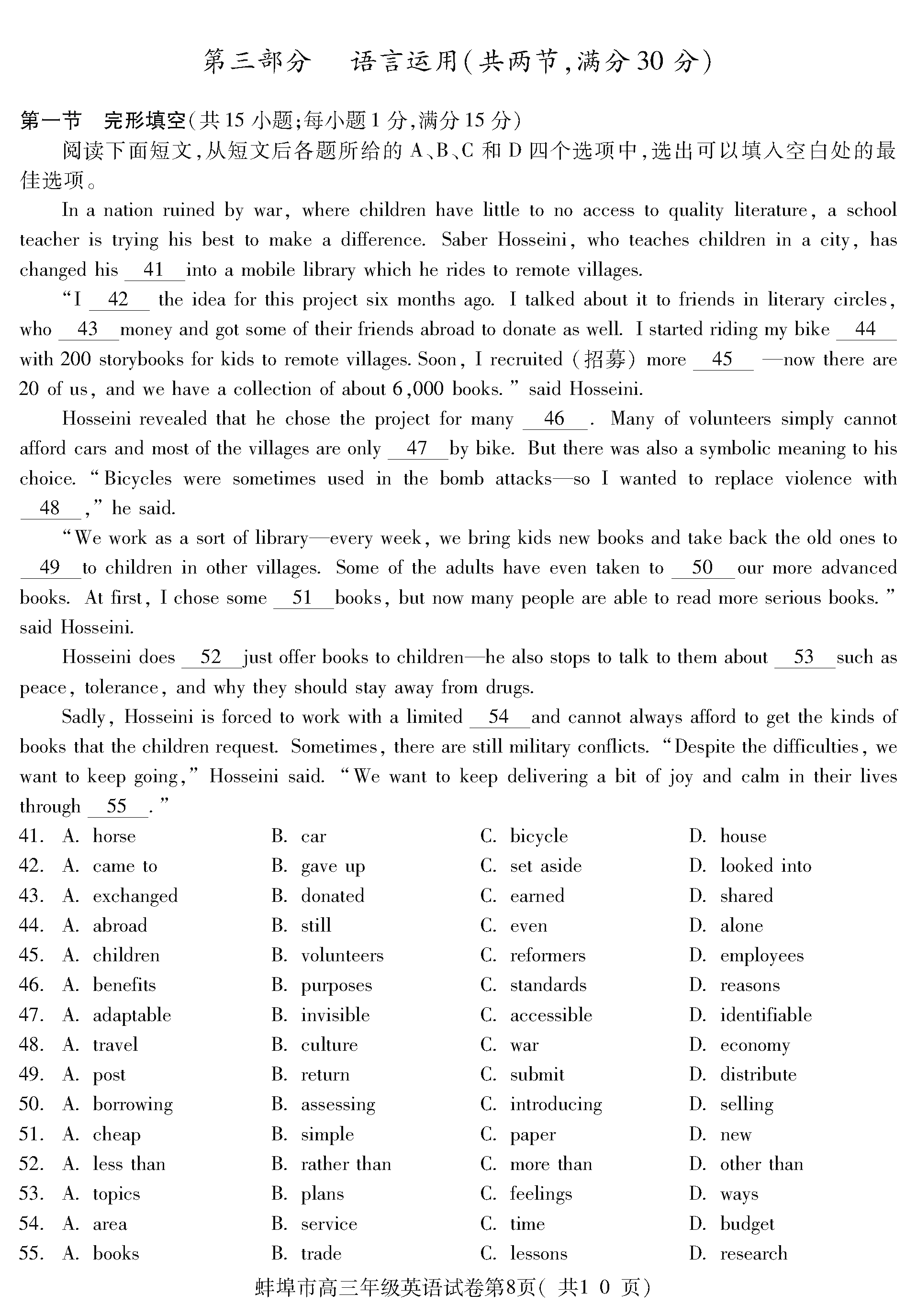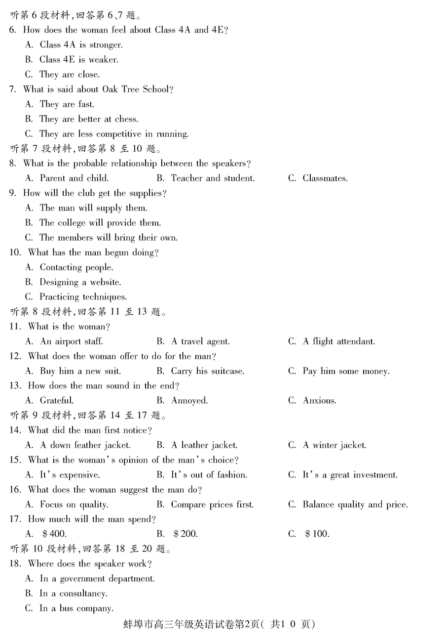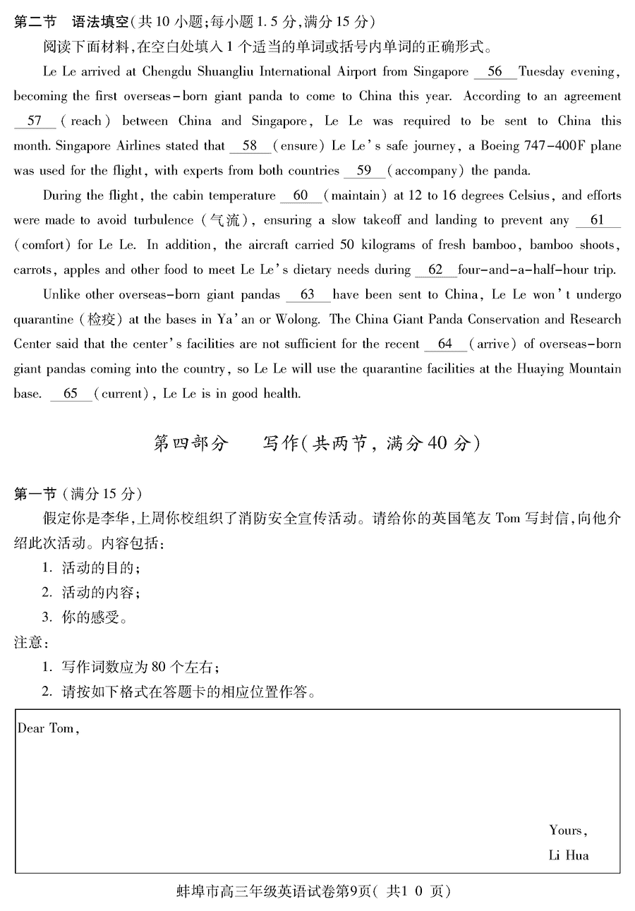 安徽蚌埠2024届高三下学期第三次质检英语试题及答案