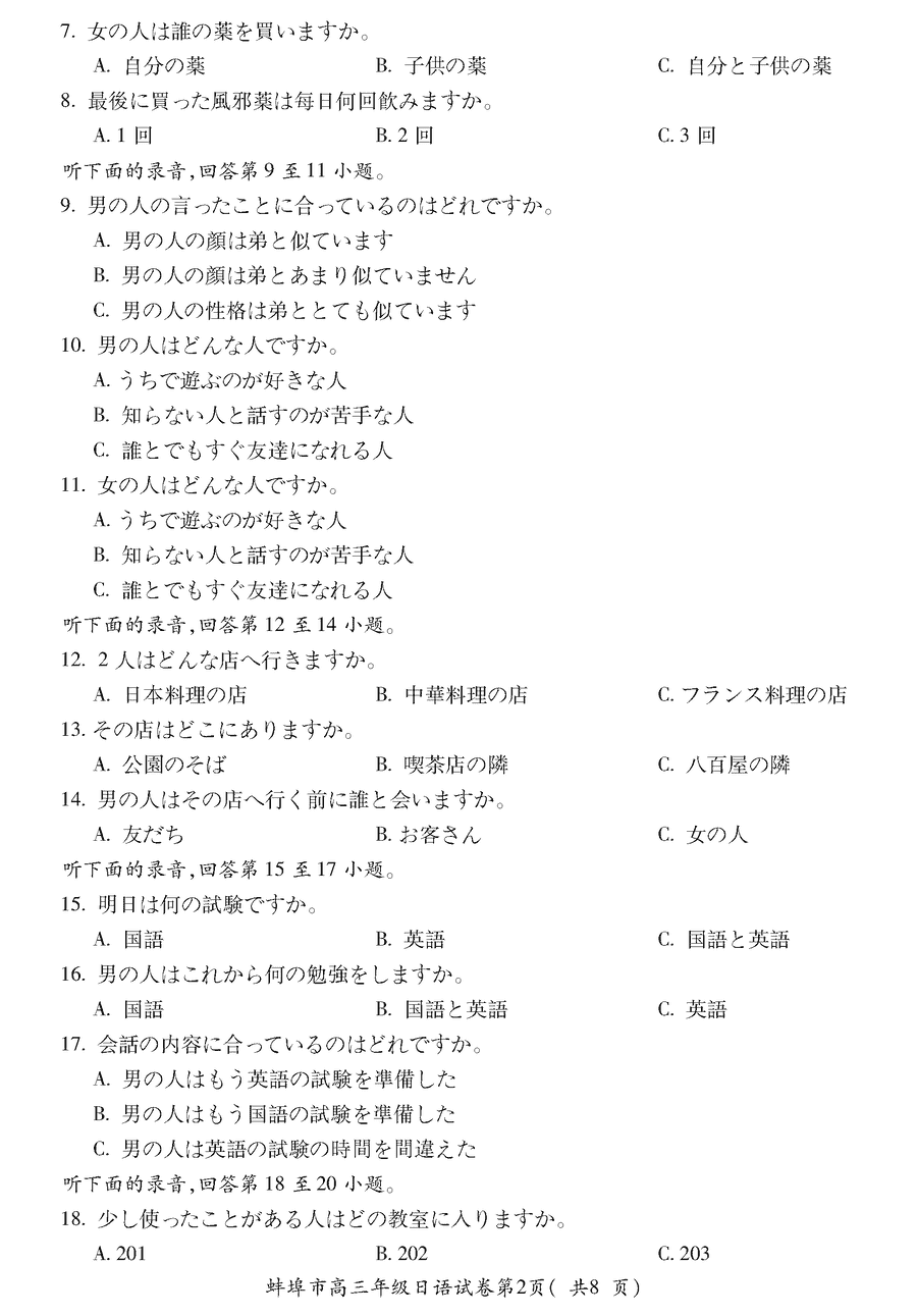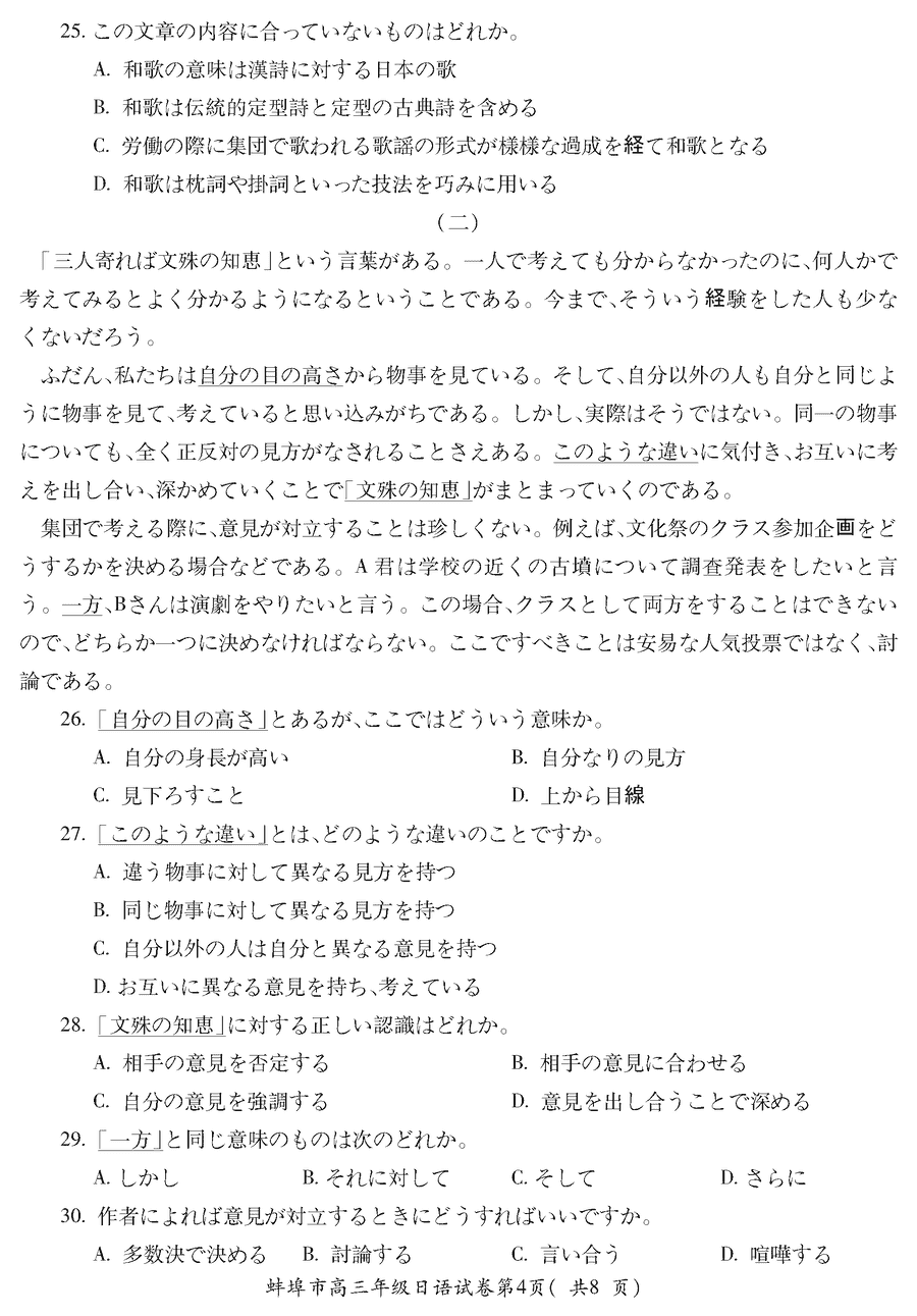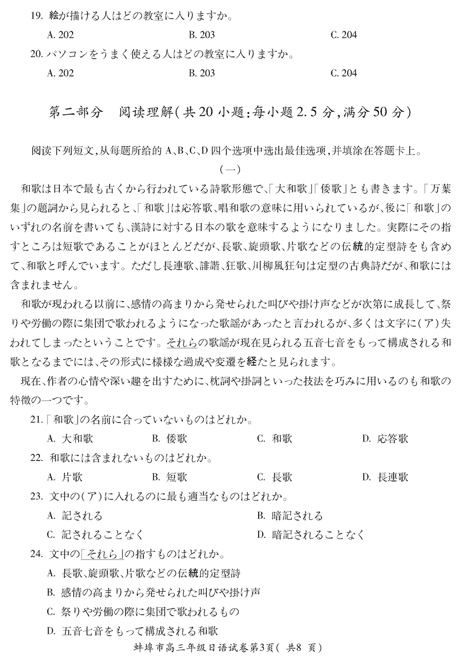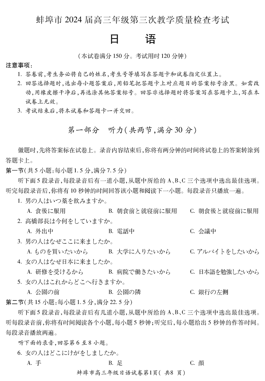 2024届安徽蚌埠高三下学期第三次质检日语考试已于近日开考,为方便考生考后及时查看考试情况,查漏补缺、弥补不足,本文整理了2024届安徽蚌埠高三下学期第三次质检日语试题答案解析相关信息!