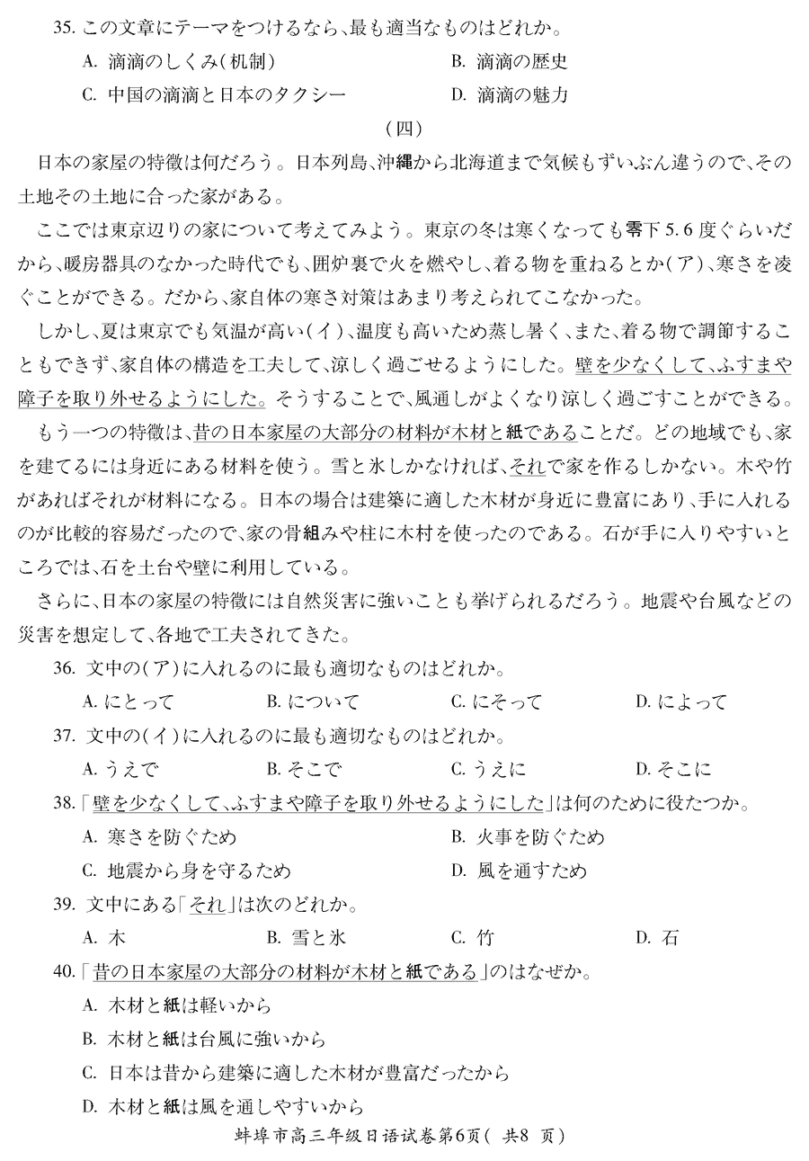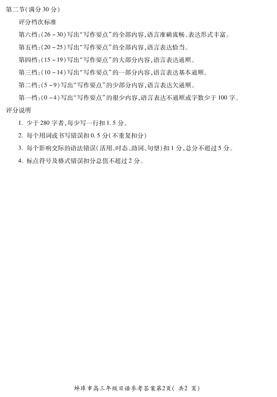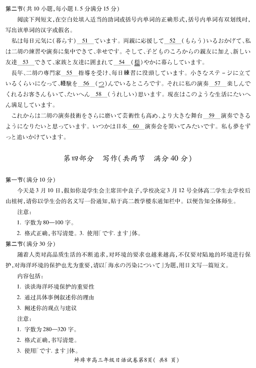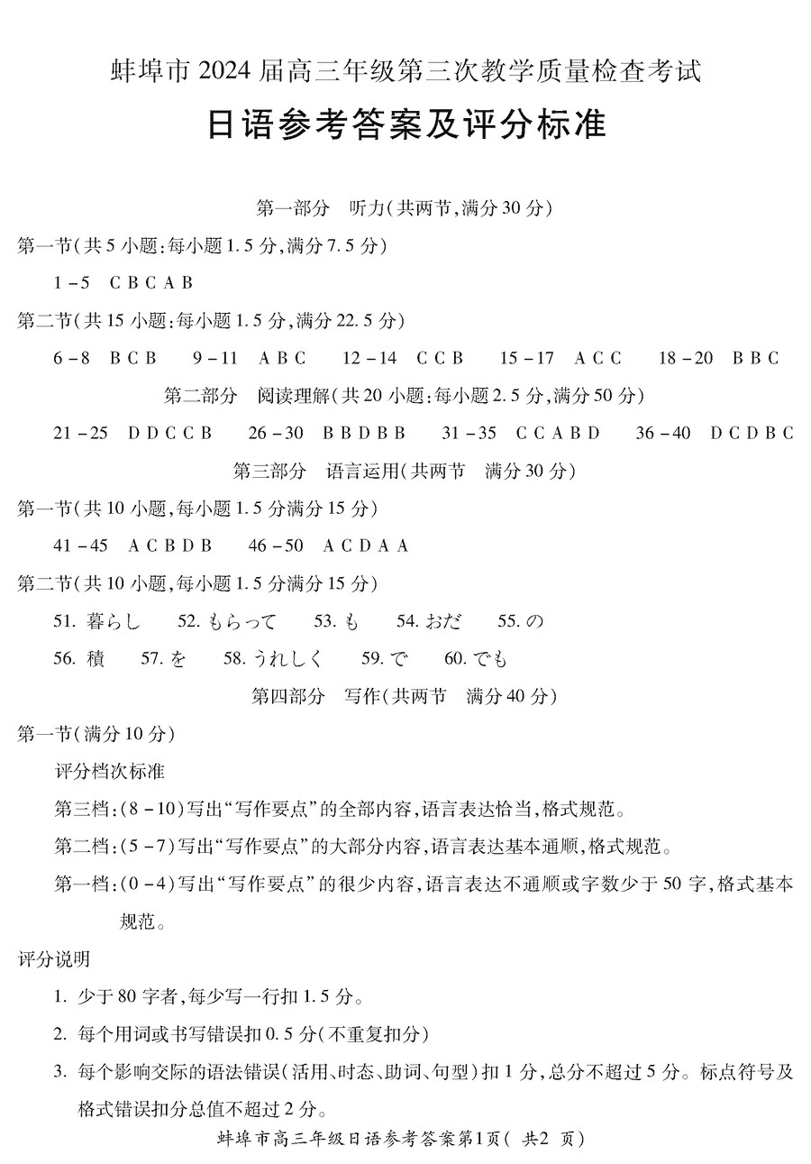 安徽蚌埠2024届高三下学期第三次质检日语试题及答案