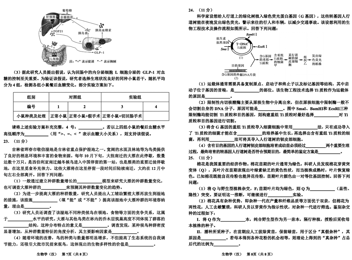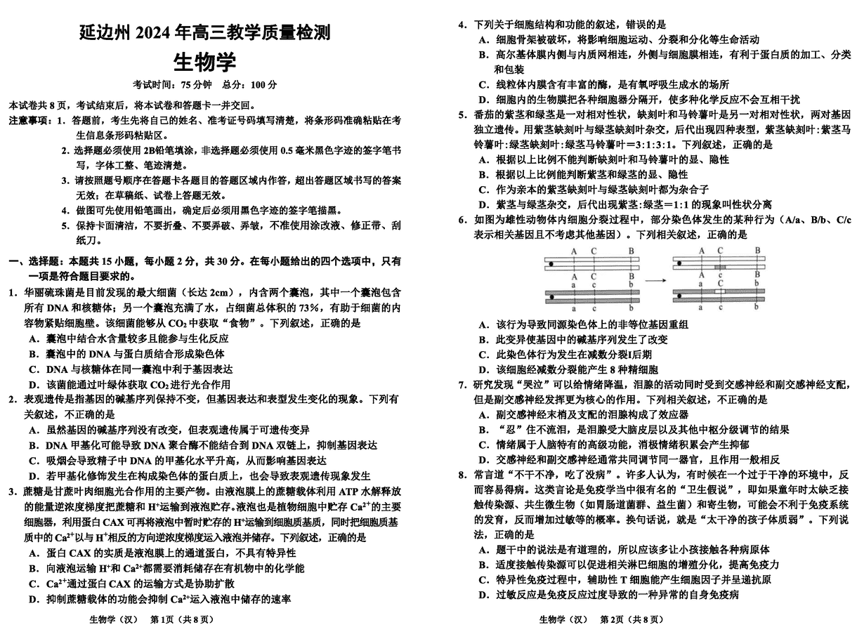 2024届吉林延边高三一模生物试题及答案