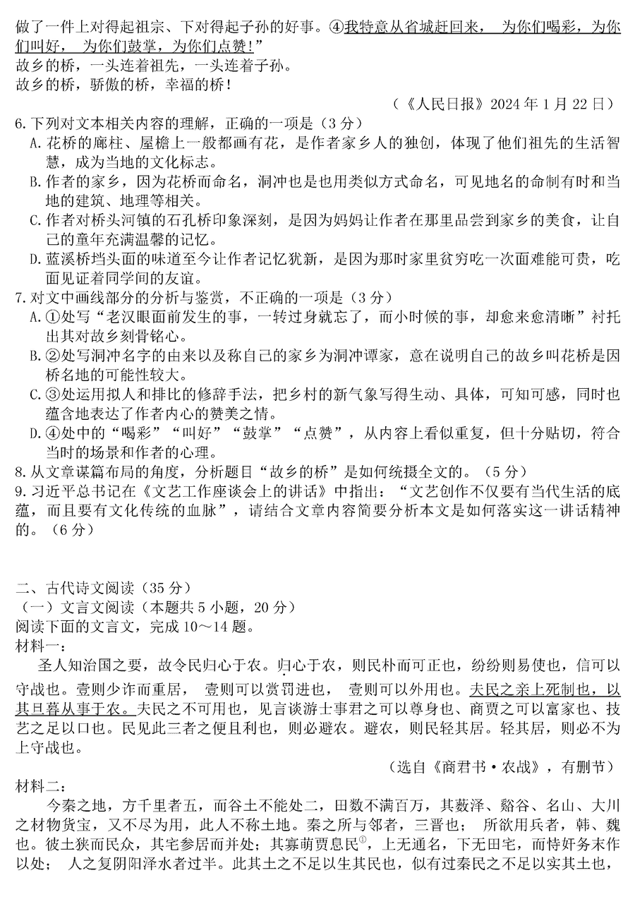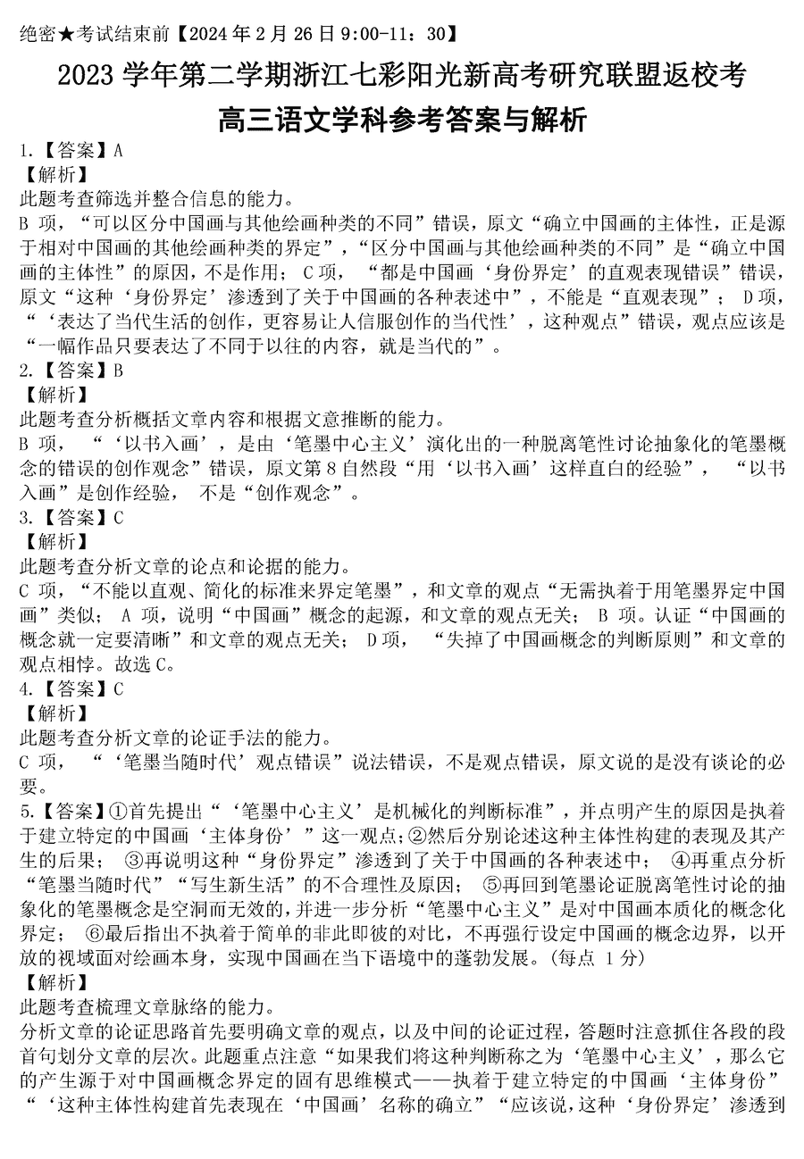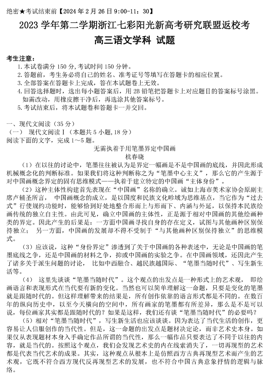 浙江七彩阳光联盟2024届高三下返校考语文试题及答案