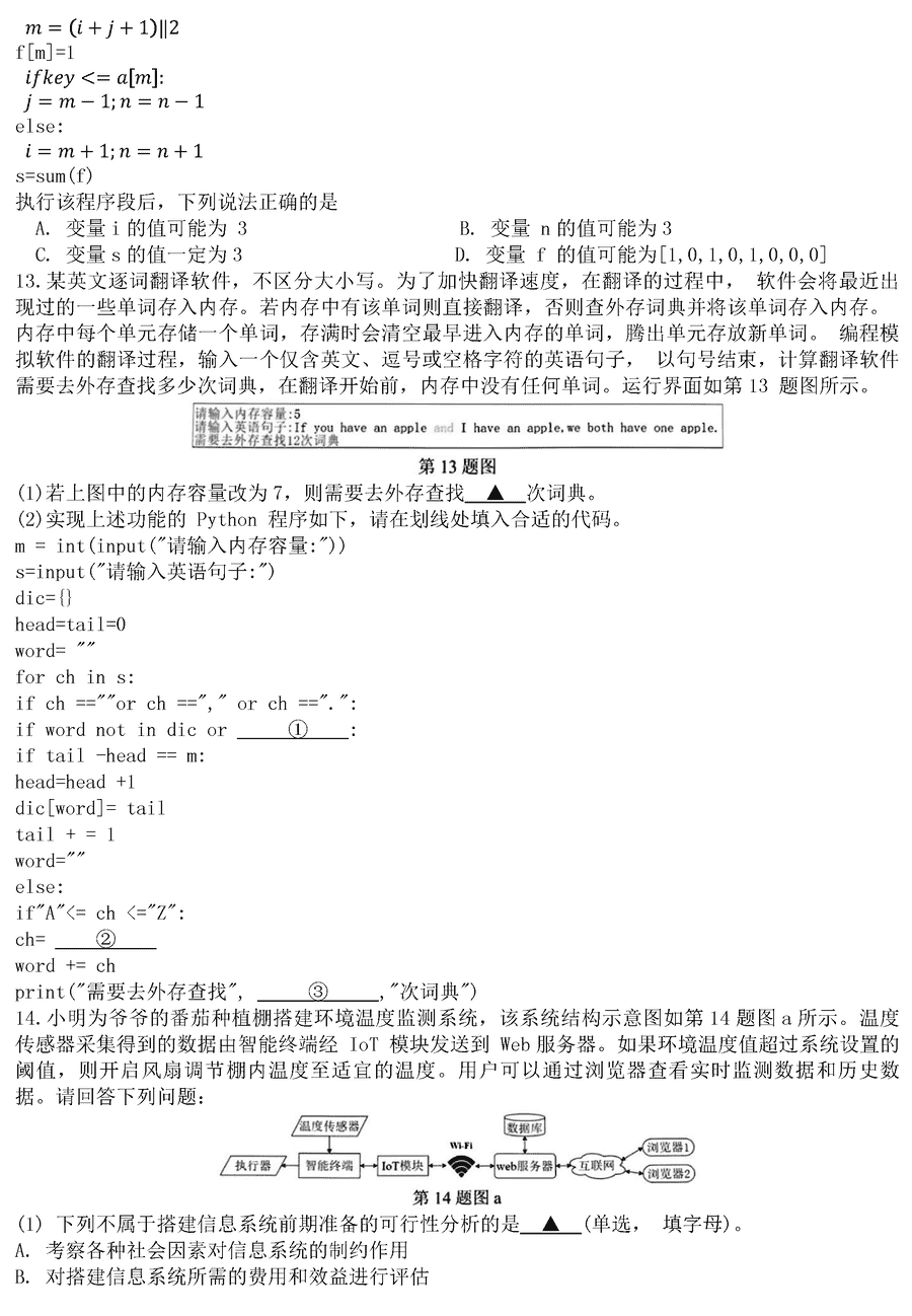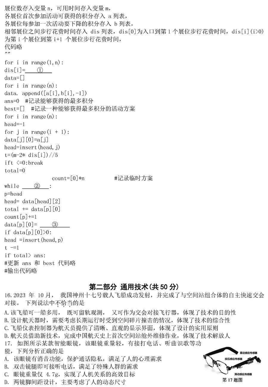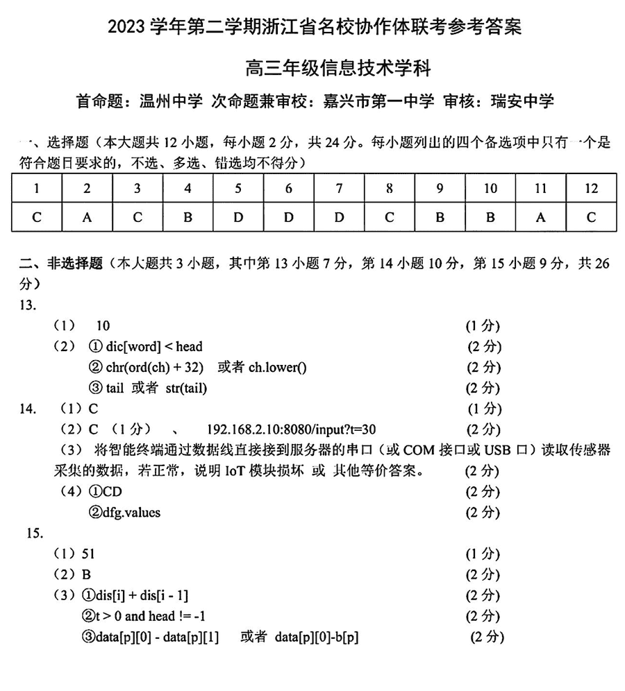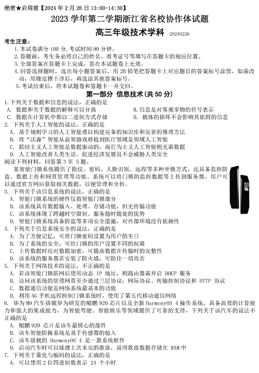 浙江名校协作体2024届高三下学期联考技术试题及答案