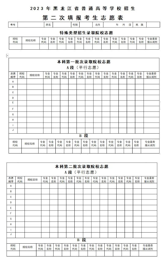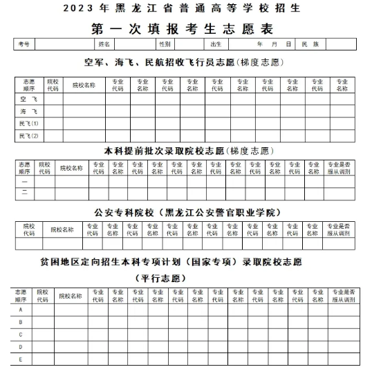 以下是黑龙江往年高考志愿表填报样本,图片来源于网络,仅供参考。