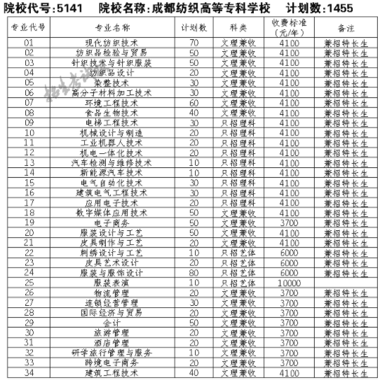 2021成都纺织高等专科学校在川单招专业及招生计划