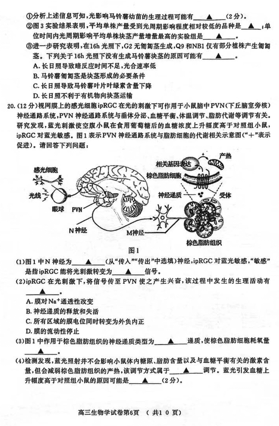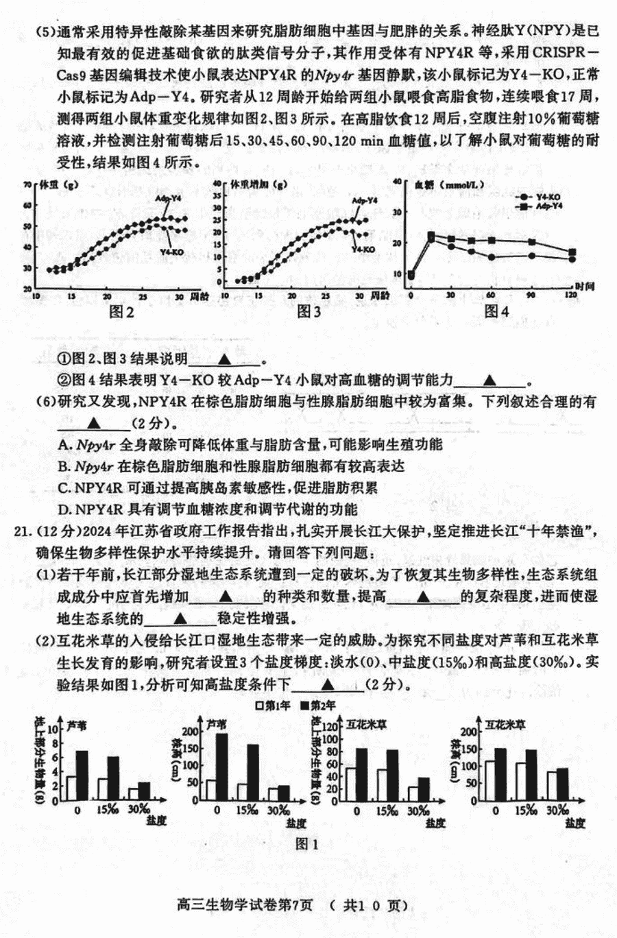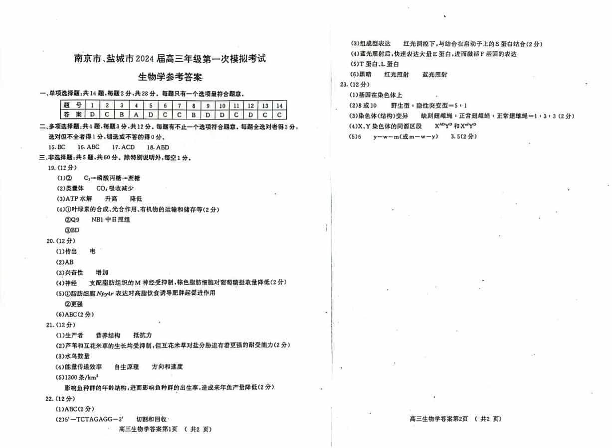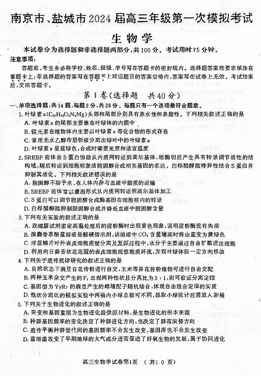 2024届南京市、盐城市高三一模生物试题及答案