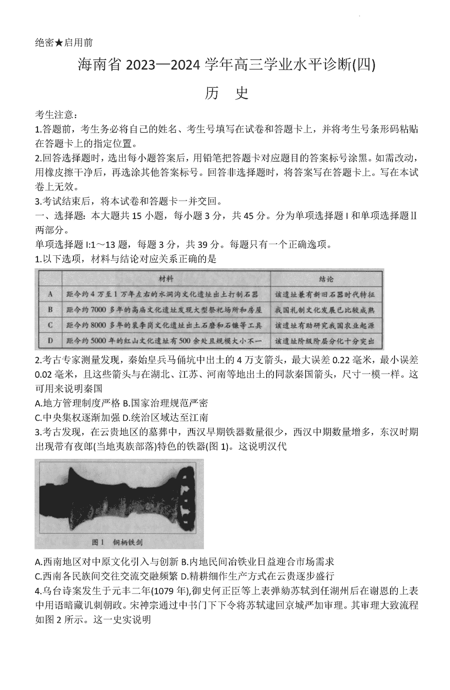 海南天一大联考2024届高三学业水平诊断(四)历史试题及答案
