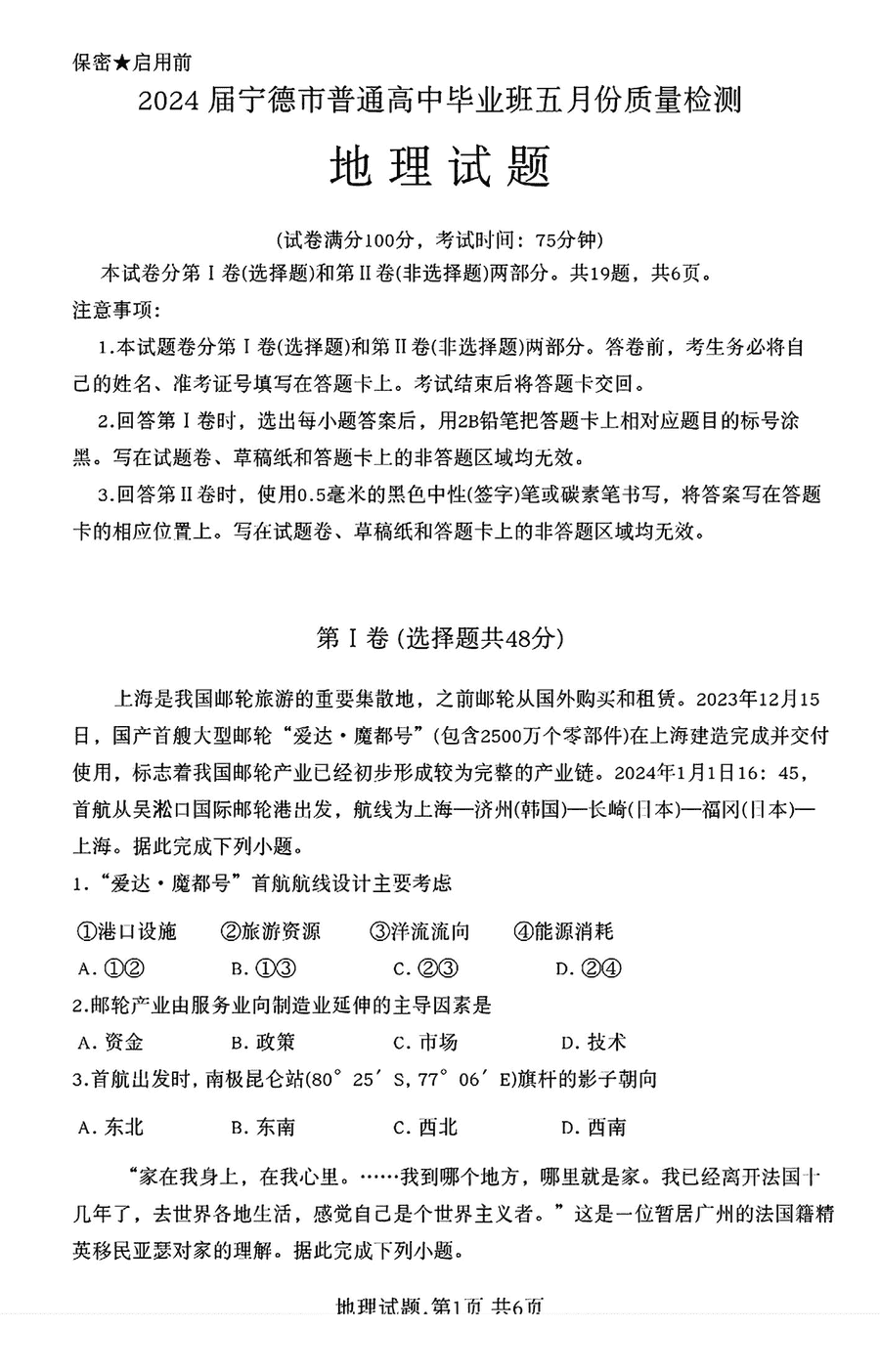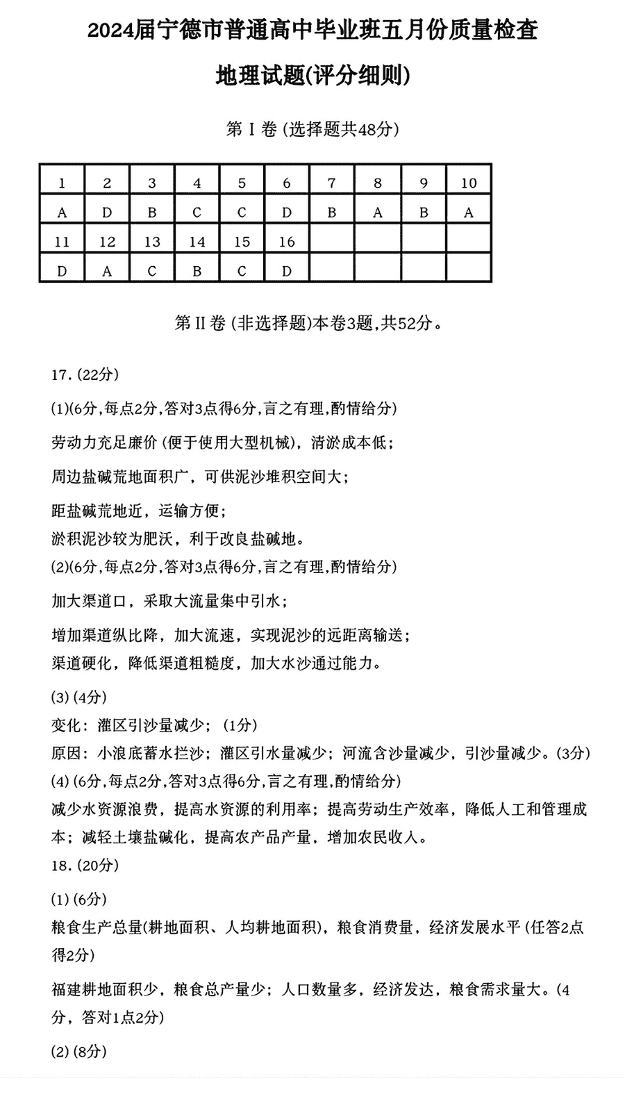 福建宁德2024届高三5月第三次质检地理试题及答案 时间:2024-05-08 14:29 福建 文综试题 2024届福建省宁德市高三5月第三次质量检测地理考试已于近日开考,为方便考生考后及时查看考试情况,查漏补缺、弥补不足,本文整理了试题答案解析相关信息! 汇总:宁德2024届高三5月第三次质检 地理试题及答案解析