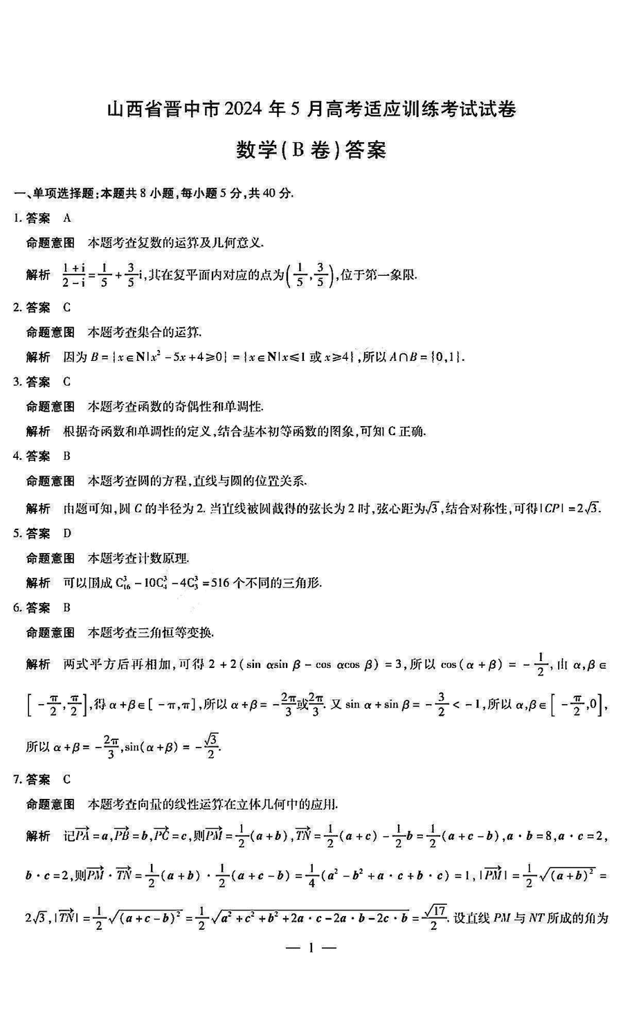 山西晋中2024届高三5月高考适应训练数学试题及答案 时间:2024-05-11 13:58 山西 数学试题 山西晋中2024届高三5月高考适应训练数学考试已于近日开考,为方便考生考后及时查看考试情况,查漏补缺、弥补不足,本文整理了试题答案解析相关信息! 汇总:山西晋中2024届高三5月高考适应训练考 数学试题及答案解析