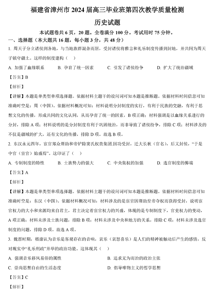 福建漳州2024届高三第四次质检历史试题及答案 时间:2024-05-12 12:38 福建 文综试题 福建漳州2024届高三第四次质检历史考试已于近日开考,为方便考生考后及时查看考试情况,查漏补缺、弥补不足,本文整理了试题答案解析相关信息! 汇总:福建漳州2024届高三第四次质检 历史试题及答案解析