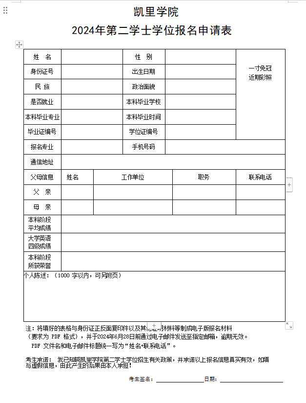 (5)填好的《凯里学院2024年第二学士学位报名申请表》,打印签字的扫描件(PDF格式)1份。
