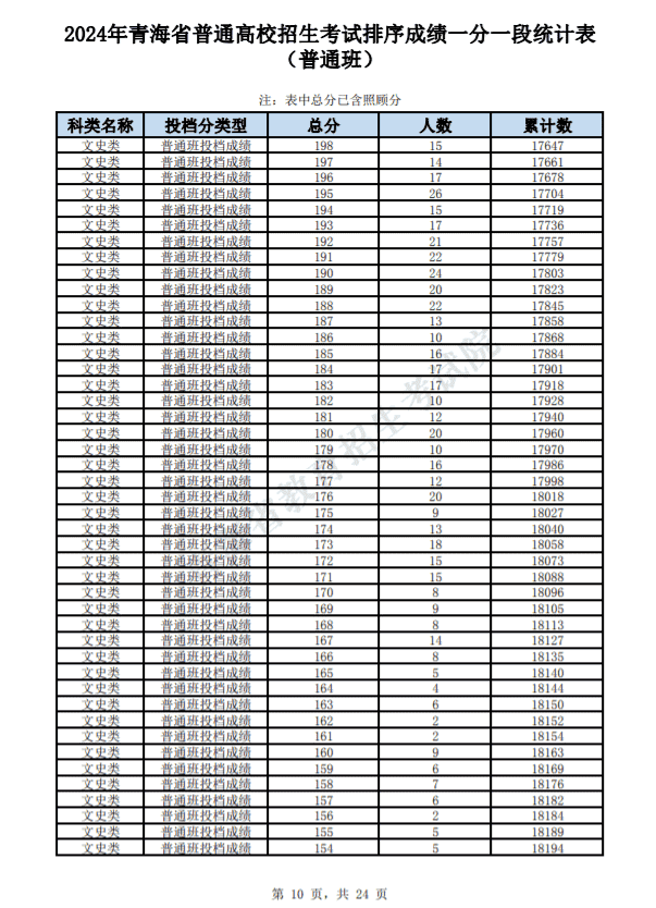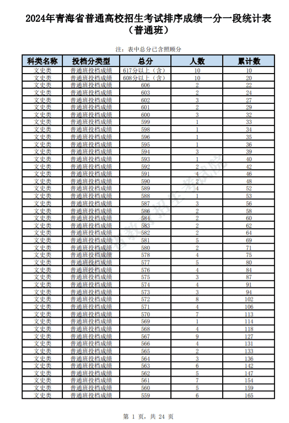 2024青海高考文科高考成绩606分有2人,累计人数22人,文科高考成绩603分,有2人。累计人数24人,文科高考成绩602分有3人,累计人数27人。